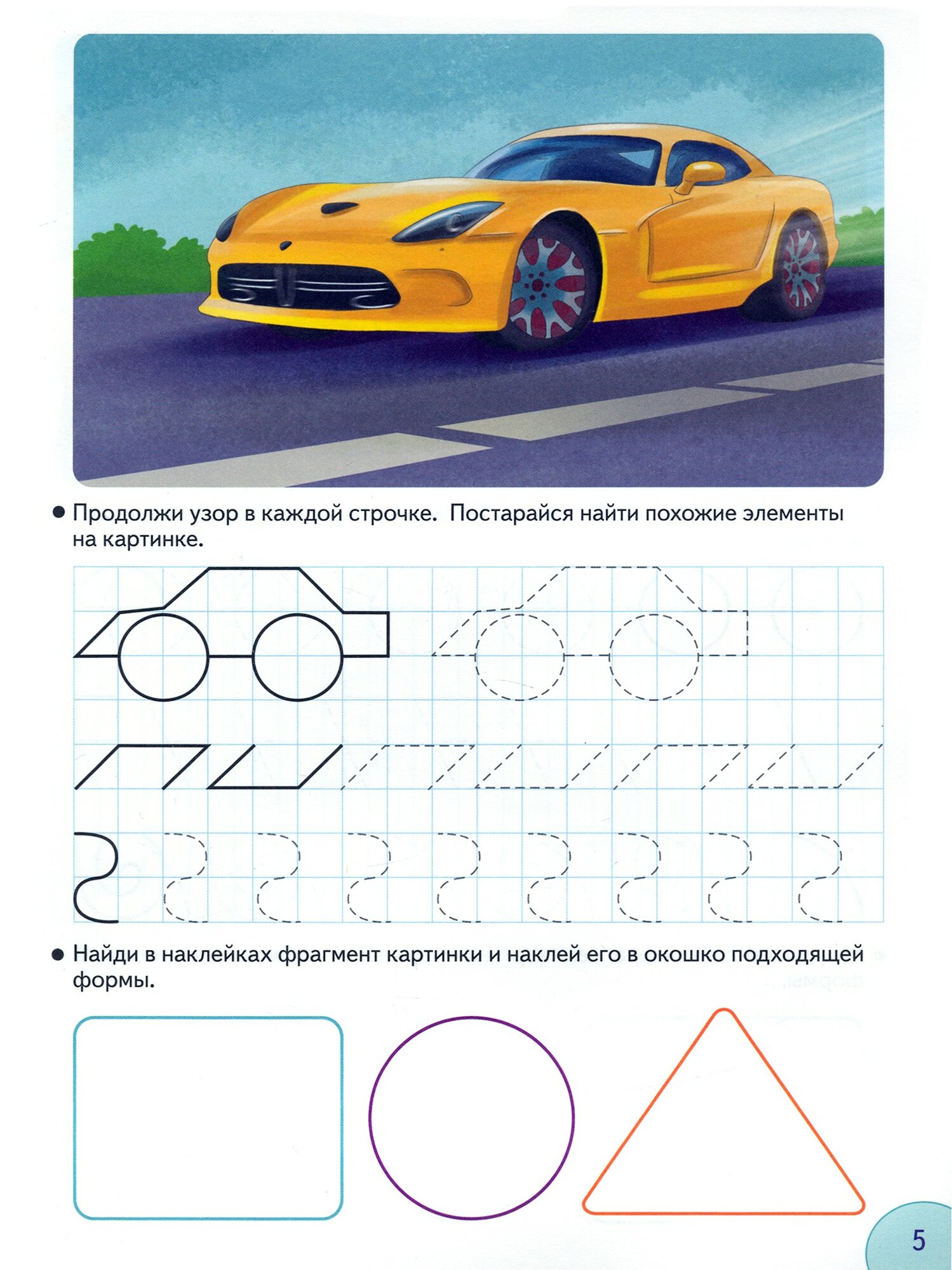 Извилистые повороты, округлые легковушки, угловатые джипы, геометрические рисунки на автомобильных шинах - каких только форм и линий нет в дорожном мире! Наблюдай, сравнивай и обводи узоры по вспомогательному контуру.