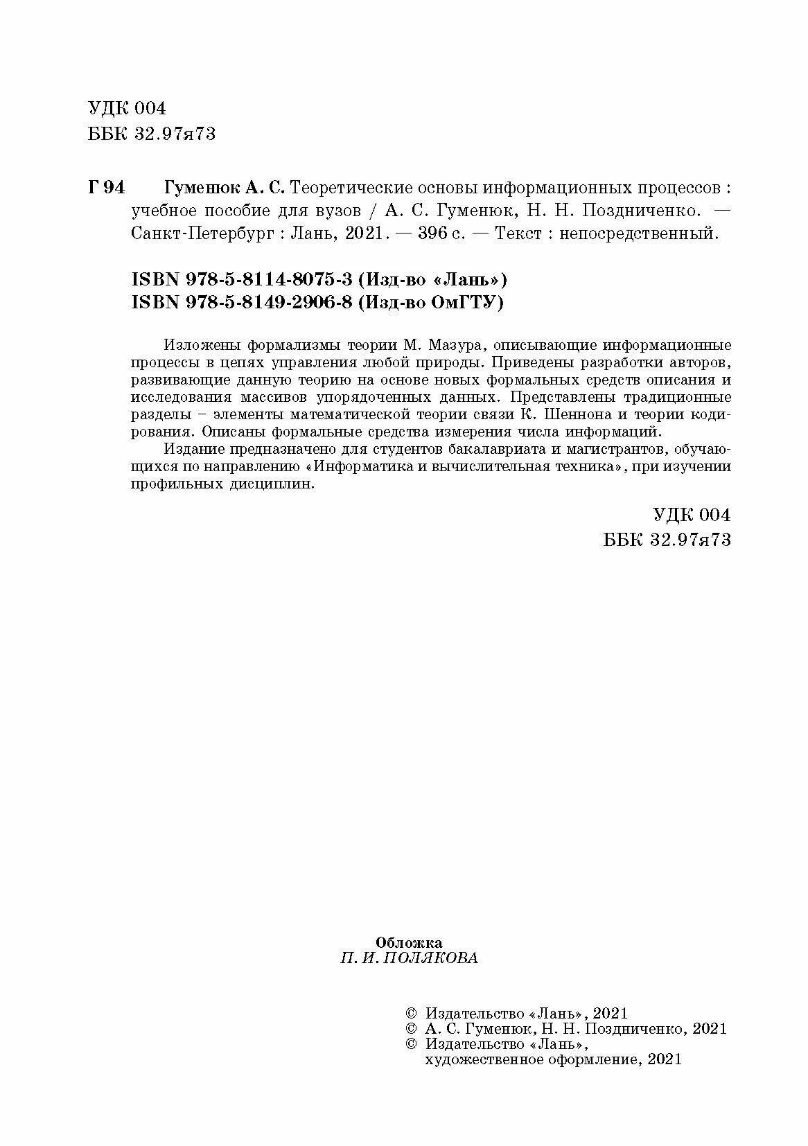 Теоретические основы информационных процессов. Учебное пособие для вузов (Гуменюк Александр Степанович, Поздниченко Николай Николаевич); Лань, 2021