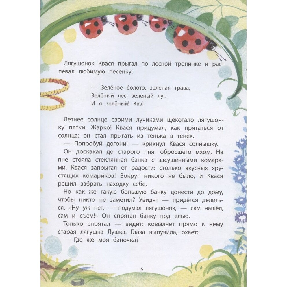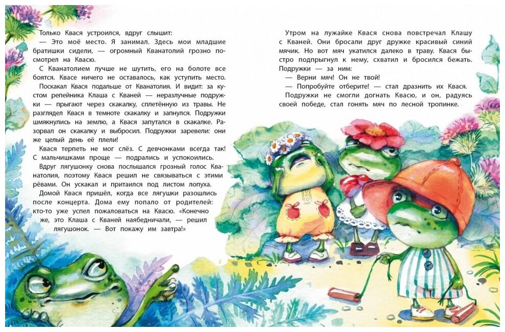 Лягушонок Квася задира и забияка. Он постоянно обижает маленьких и ссорится с девочками! Его любимая присказка: "Попробуй, догони! Попробуй, отбери! ". А еще он ужасно не любит ни с кем делиться. Поэтому у Кваси нет друзей. Неужели лягушонок так и не поймет, что играть в мяч интереснее всем вместе, ягоды есть вкуснее, если их не прятать за спиной, а делать добрые дела гораздо приятнее, чем вредничать? Читайте и узнаете.