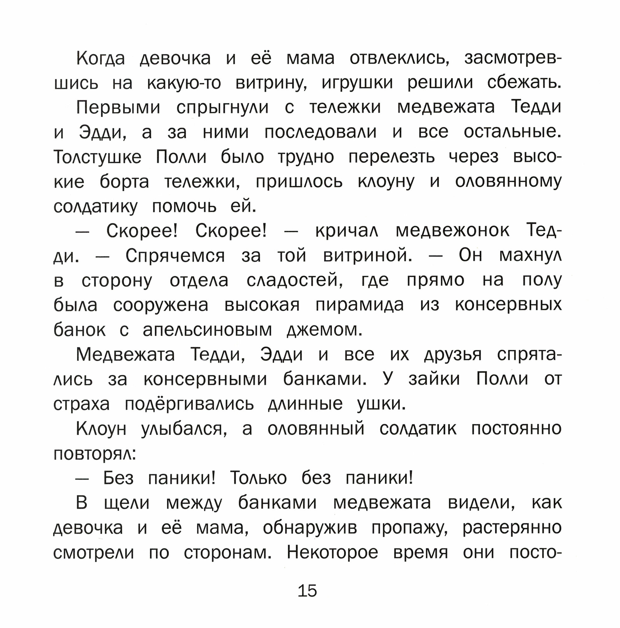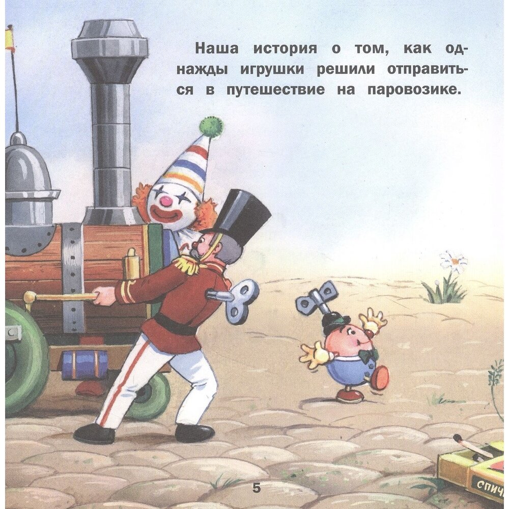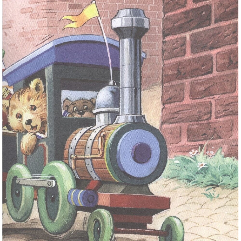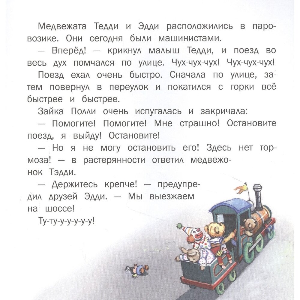 В магазине игрушек живет маленький непоседливый медвежонок Тедди. У него много друзей - медвежонок Эдди, кукла Долли, зайка Полли, клоун и оловянный солдатик. Они постоянно убегают из магазина и попадают в разные истории. В этой книжке игрушки сначала отправятся в путешествие на паровозике, а потом малыша Тедди похитит огромная ворона, и друзьям придется его выручать!