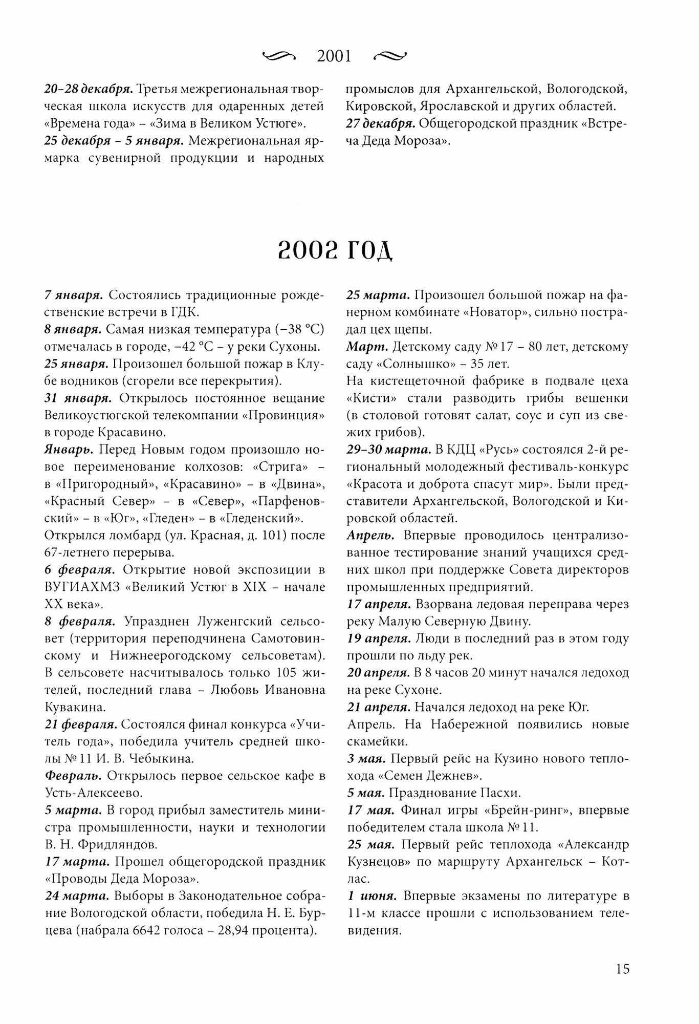 В книге обобщен материал, собранный автором за 26 лет. В ней содержится подробная летопись важных исторических событий города Великого Устюга и района конца XX - начала XXI века, а также, кроме названия исторического события, помещены и любопытные факты. Можно проследить судьбу предприятий, организаций, учреждений, узнать заслуженных людей нашего города и района.