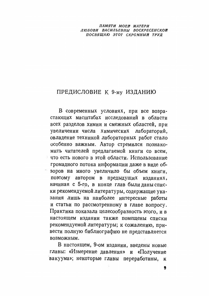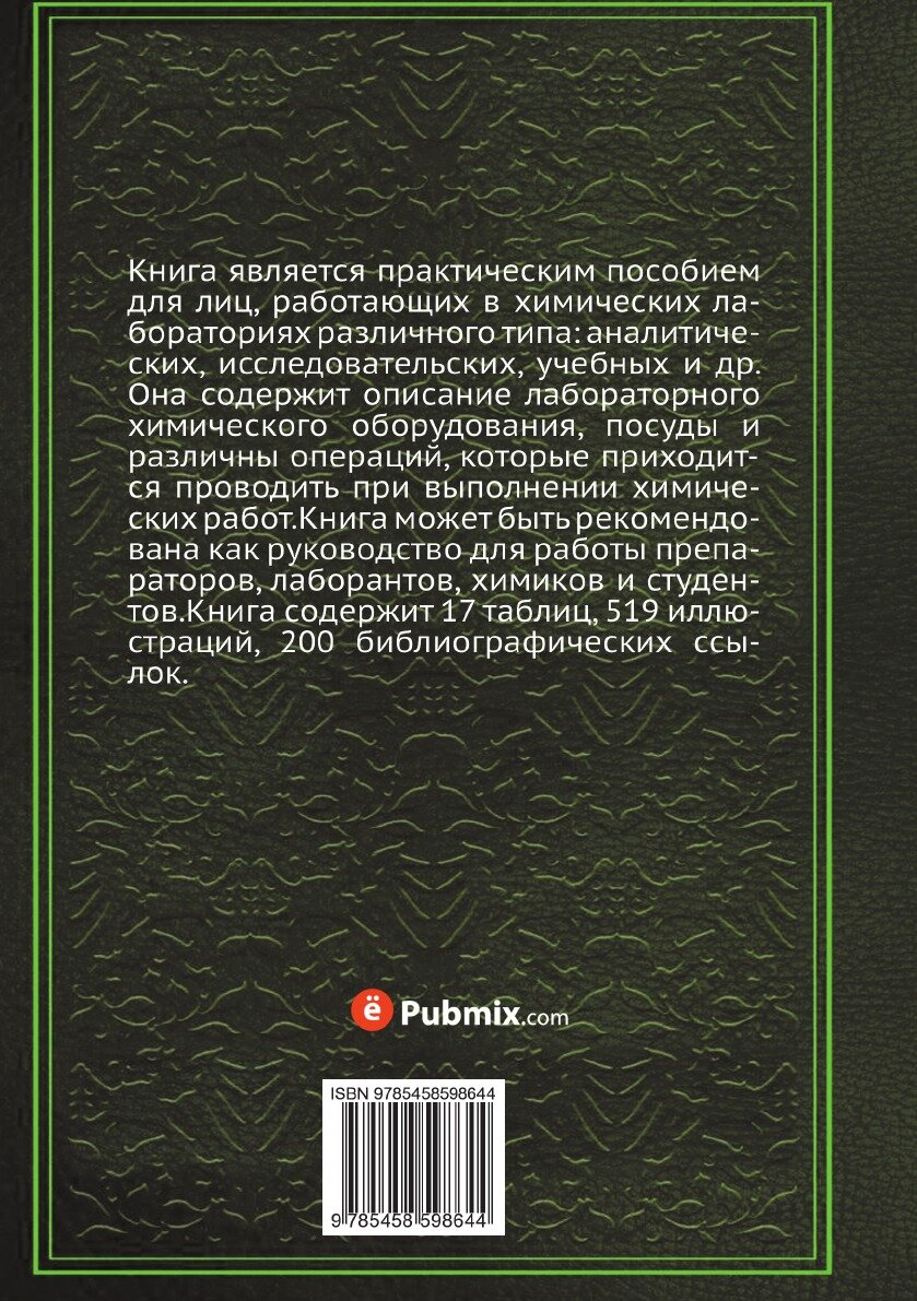 Книга является практическим пособием для лиц, работающих в химических лабораториях различного типа: аналитических, исследовательских, учебных и др. Она содержит описание лабораторного химического оборудования, посуды и различны операций, которые приходится проводить при выполнении химических работ. Книга может быть рекомендована как руководство для работы препараторов, лаборантов, химиков и студентов. Книга содержит 17 таблиц, 519 иллюстраций, 200 библиографических ссылок. Воспроизведено в оригинальной авторской орфографии издания 1969 года (издательство "Москва Химия").