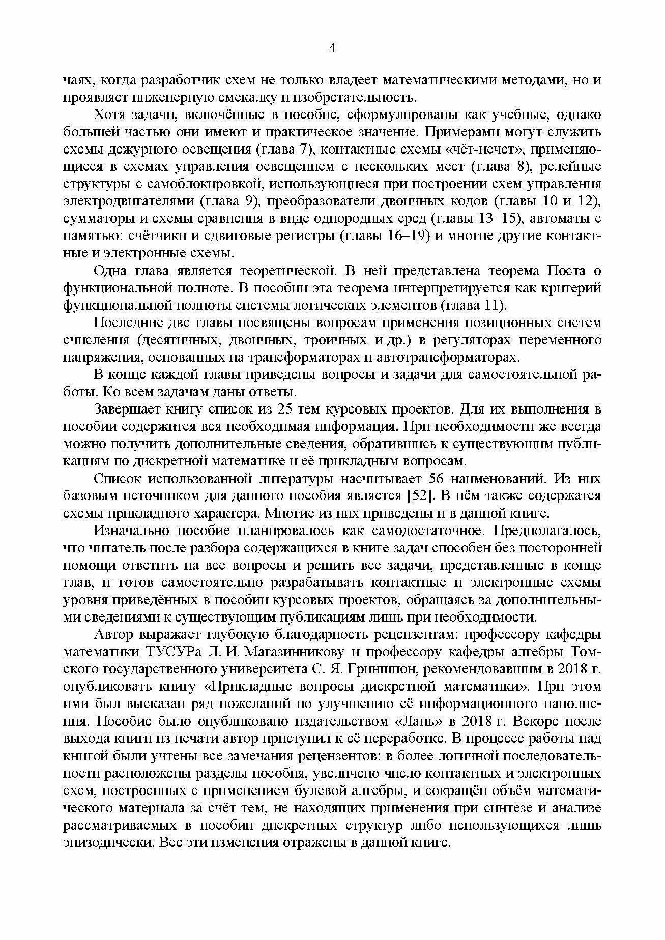 В пособии 22 раздела. Из них первые четыре посвящены матема-тическим темам: комбинаторике, булевой алгебре и булеву дифферен-циальному исчислению. В двух разделах представлены необходимые сведения о реле, тумблерах, трансформаторах, электродвигателях, тран-зисторах, резисторах, конденсаторах, диодах и др., составляющих основу технической среды, в которой применяется дискретная математика. Пять разделов посвящены контактным структурам, десять — электронным. В них рассматриваются методы логического синтеза контактных струк-тур, комбинационных схем и автоматов с памятью. Некоторое внимание уделено синтезу однородных сред ленточного типа: управление освеще-нием с многих мест, схемы «чёт-нечёт», схемы сравнения и др. В послед-нем разделе приведён список тем курсовых проектов.