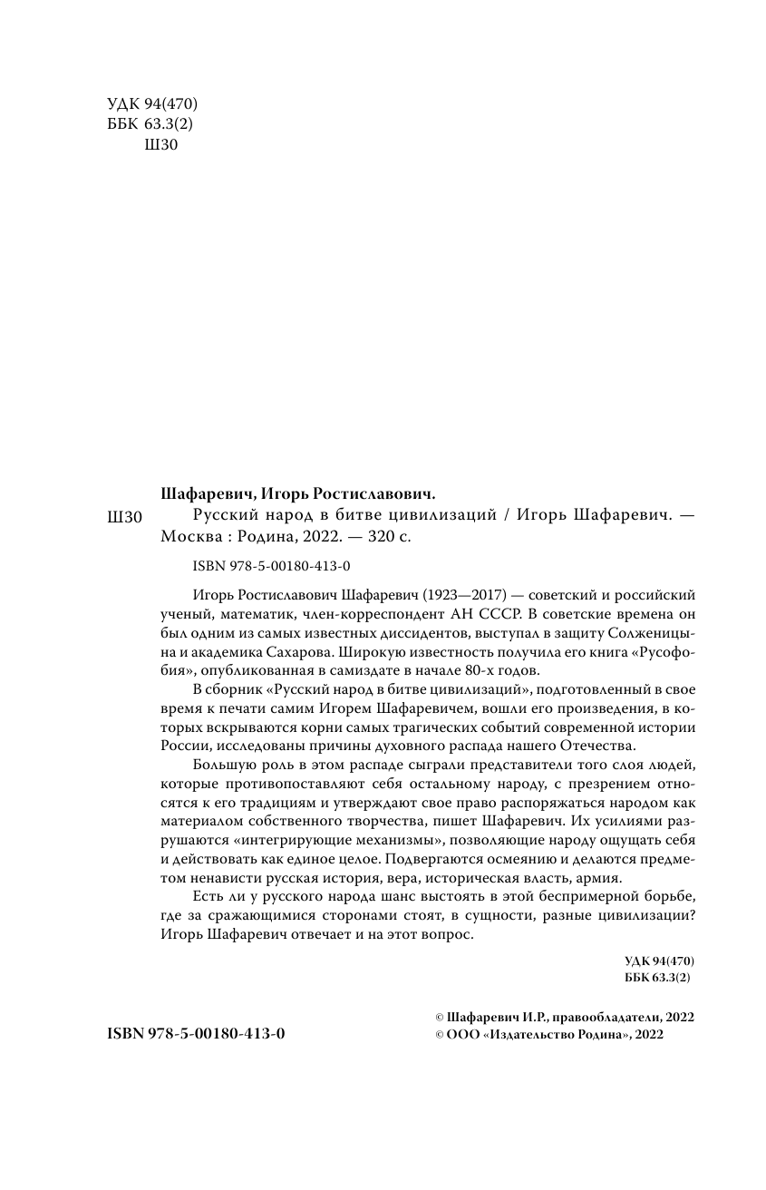 В сборник "Русский народ в битве цивилизаций", подготовленный в свое время к печати самим Игорем Шафаревичем, вошли его произведения, в которых вскрываются корни самых трагических событий современной истории России, исследованы причины духовного распада нашего Отечества.
