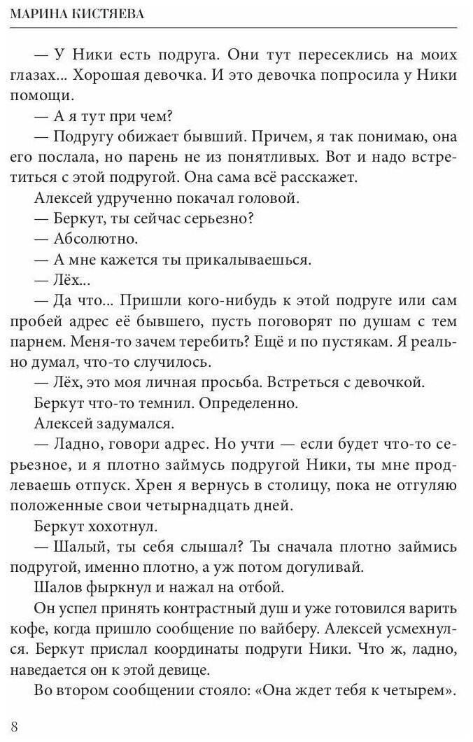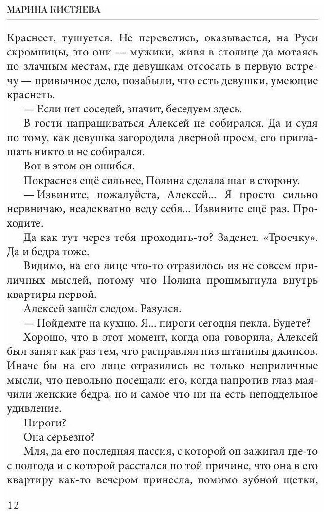 Наверное,не каждому "зайдет" стиль изложения Кистяевой... Наверное, книга хорошая, но интересной мне лично она не показалась! Я два раза начинала ее читать, но оба раза бросала на пятой главе. Автор полунамеками излагает то,о чем приходится догадываться,герои постоянно говорят обо всем,старательно обходя главное,нам подробно описывают,что они в настоящий момент делают и о чем размышляют,но это как бы и то, и не то... Короче говоря, моего терпения дочитать хотя бы до середины не хватило! Тем более, что и так понимаешь,в чем "засада" и чем это все заканчивается в современных любовных романах. Но это мое субъективное мнение!"Девочка генерала" мне понравилась, хотя тоже временами раздражала некоторая затянутость, но "Нокаут"- нет,не могу заставить себя почитывать. Какой то поток сознания!