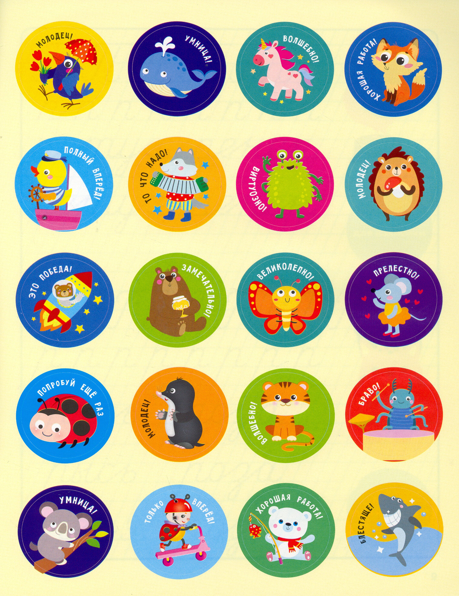 Не секрет, что хвалить ребёнка очень важно. Ведь тем самым вы поддерживаете у него интерес к учёбе и уверенность в своих силах. В этих прописях за правильное и аккуратное выполнение заданий вашего маленького ученика ждут призы - поощрительные наклейки. Ребёнок сам может выбрать понравившуюся ему наклейку и разместить её рядом с выполненным заданием.