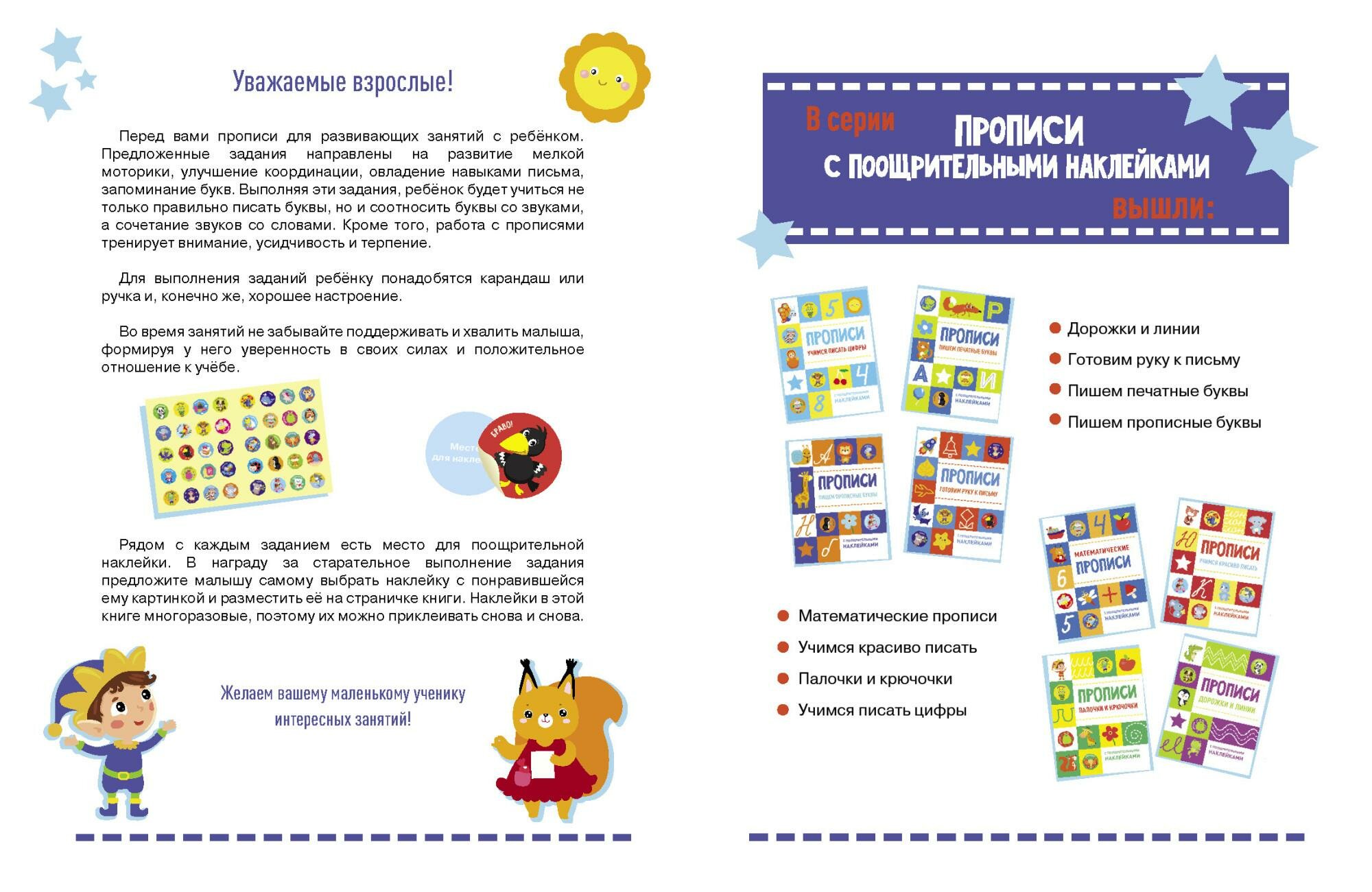 Не секрет, что хвалить ребёнка очень важно. Ведь тем самым вы поддерживаете у него интерес к учёбе и уверенность в своих силах. В этих прописях за правильное и аккуратное выполнение заданий вашего маленького ученика ждут призы - поощрительные наклейки. Ребёнок сам может выбрать понравившуюся ему наклейку и разместить её рядом с выполненным заданием.