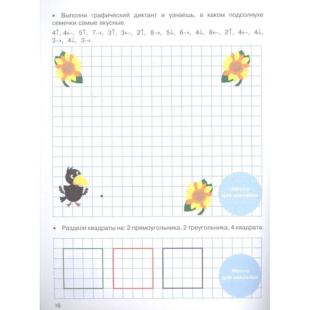 Прекраснейшая пропись для развития математических и логических способностей. Купила пятилетнему сыну для самостоятельных занятий с ним летом (старшая детсадовская группа). Занятия все очень интересные, разнообразные. Ребёнок учится постепенно всему, нет такого, что не по силам. Особенно понравились графические диктанты, с которыми можно справиться даже не умея читать: достаточно знать цифры, а рядом указано направление, в которое откладывать нужное количество клеток.