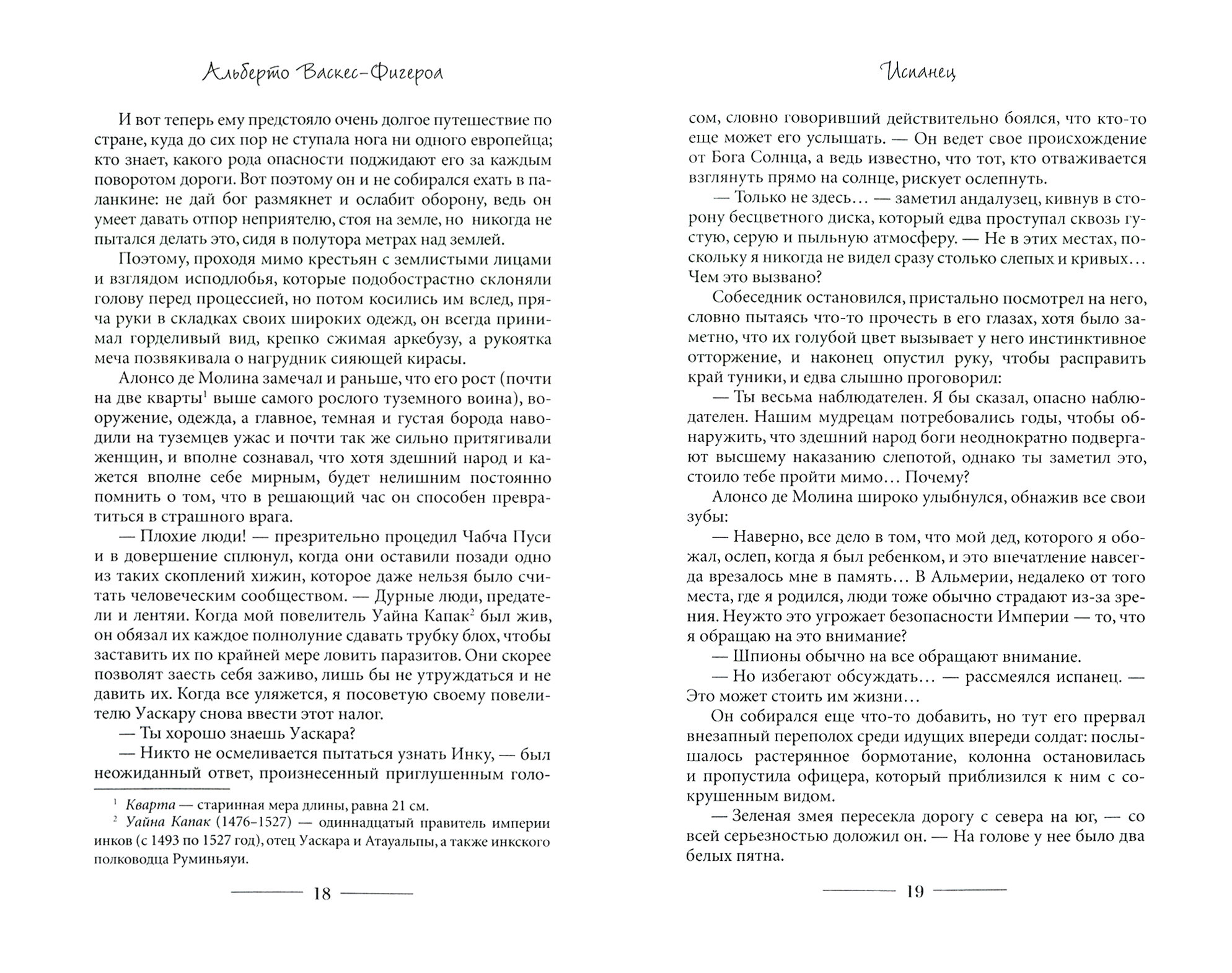 Книга оставляет очень положительное впечатление. Она очень атмосферная, и в ней много исторических деталей, которые поданы не сухо, а с погружением. Архитектура, природа, нравы, обычаи - Альберто Васкес-Фигероа всё это дал, и дал хорошо. Мы прогуляемся по мосту инков, поддерживать который в идеальном состоянии - долг ближайшей деревни. Мост идеален, ведь если что с ним не так - ответственных за него утопят в реке. Мы познакомимся с аборигеном, который сделал из негра барабан потому, что у негра такая редкая кожа. Покупаемся в ледяных озёрах и прогуляемся по идеальной, "с математической точностью" прорубленной в горах лестнице. Погостим в полной золота столице инков. Увидим, на что готов старый инка, чтобы сохранить семью. Посмотрим, как выбирает герой между своей старой родиной, Испанией, своей новой страной, где он хочет жить, и своей семьёй. Главный герой - хороший мужик. Он по-своему честный и умеет любить. А как любят инки? Герой вот очень удивился, когда узнал, как. Я тоже :)