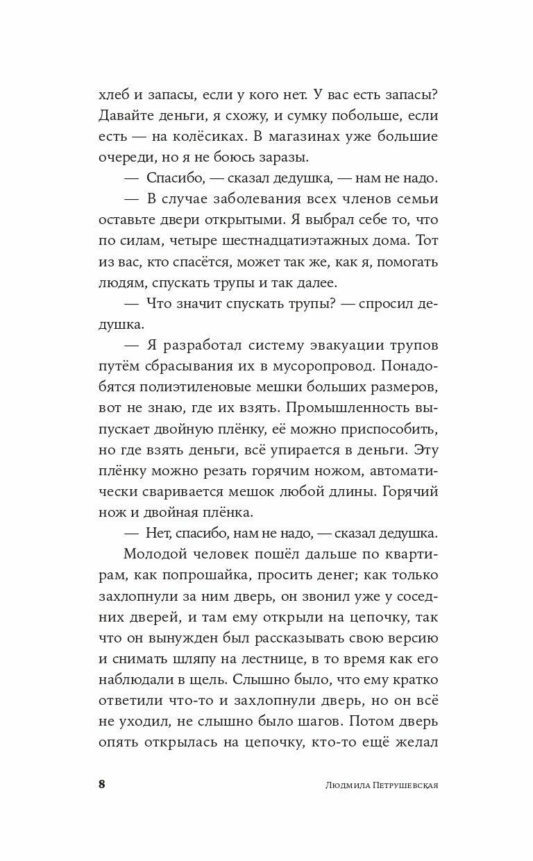 невозможно оторваться и бросить на середине. Читая эти истории впервые, действительно сначала испытываешь какое-то смутное чувство тревоги и даже неприятие. Но потом полностью погружаешься в мистический мир, созданный автором – сюрреальный, порой абсурдный, с удивительным вниманием к деталям. Некоторые же ее тексты можно назвать пророческими – как, например, «антиутопические» рассказы «Гигиена» и «Новые Робинзоны», которые хотя и написаны в 70-х, читаются как абсолютно современные в эпоху пандемии. -