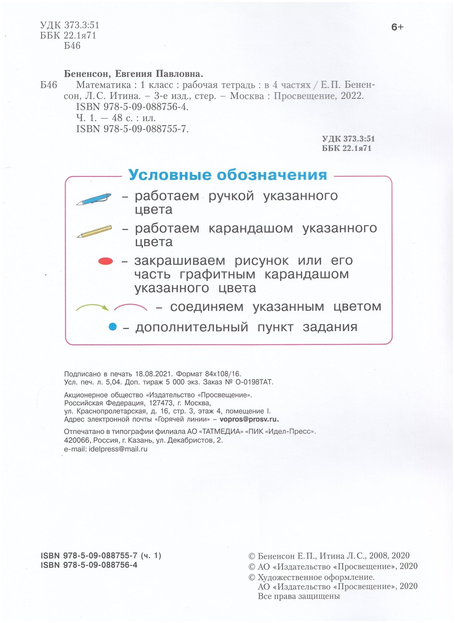 Математика 1 класс Рабочая тетрадь В 4-х частях Тетрадь 1 (Бененсон Евгения Павловна, Итина Лариса Самуиловна); Просвещение, 2022