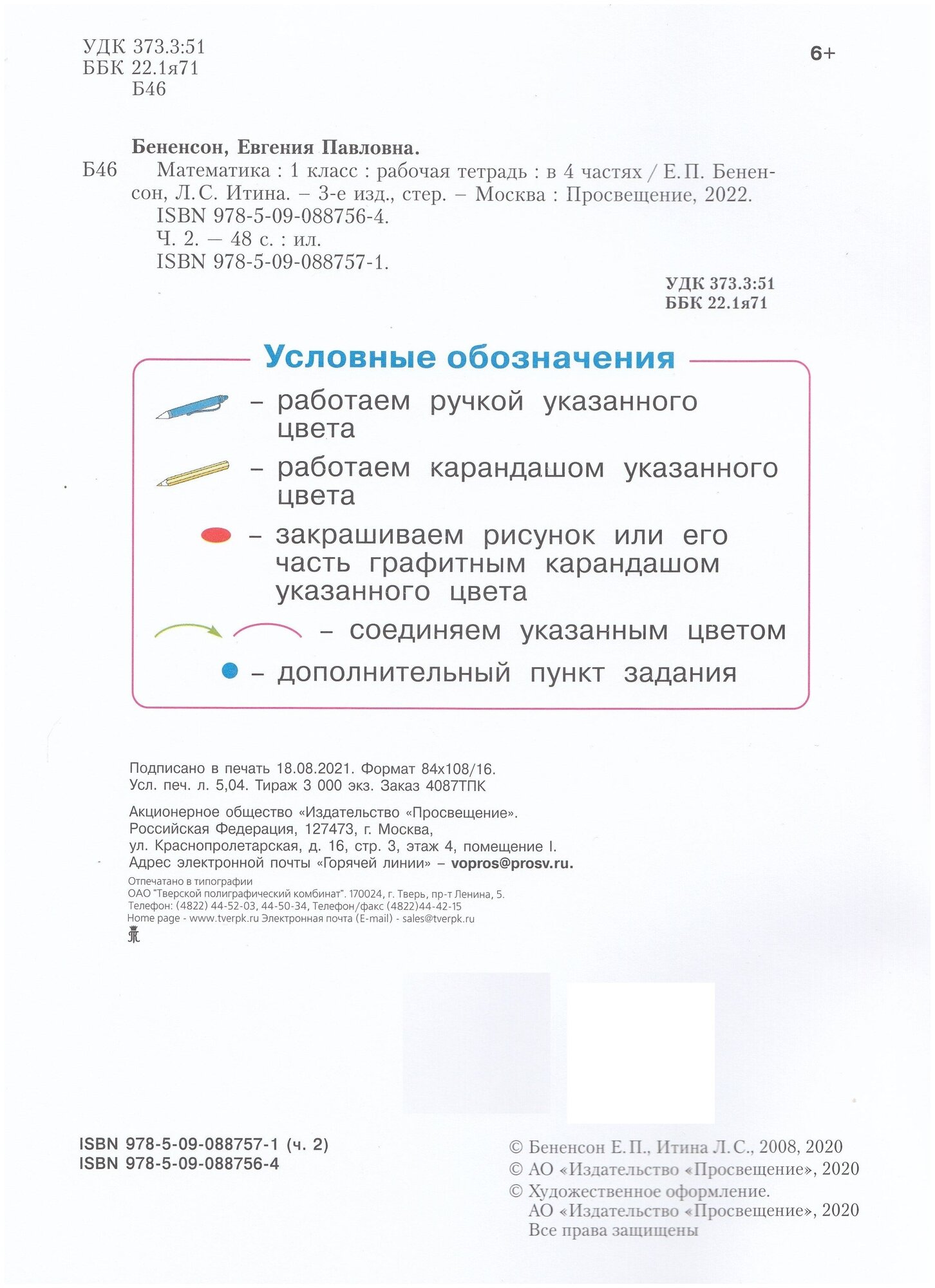 На сегодняшний день товар «Книга: Математика 1 класс Рабочая тетрадь В 4-х частях Тетрадь 2 (Бененсон Евгения Павловна; Итина Лариса Самуиловна); Просвещение, 2022» можно купить с кешбеком в 3 магазинах: book24, Буквоед, Читай-город