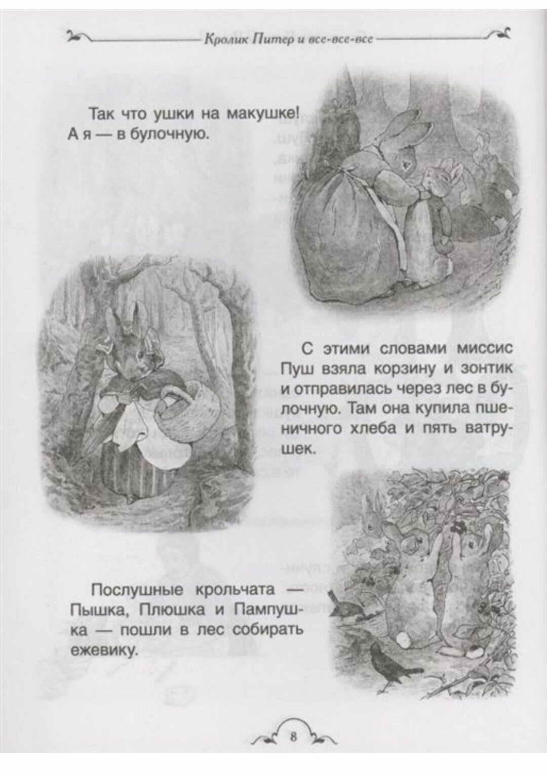 Данное издание очень заинтересовало тем, что собраны буквально все лесные истории и не только о кроликах. Они имеют мало общего с фильмом, что очень порадовало. Иллюстрации НЕ ЦВЕТНЫЕ! Но они все равно очень красивые. Сказки добрые, поучительные иногда с неожиданным концом. Листы немного тонковаты, но читать не мешает. В целом мы довольны. В целом очень хорошее издание.