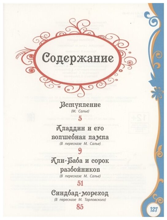 В книгу вошли "Аладдин и его волшебная лампа" и "Али-Баба и сорок разбойников" в пересказе Михаила Салье, а также "Синдбад-мореход" в пересказе Марка Тарловского. Неповторимый колорит и своеобразие средневекового Арабского Востока передают иллюстрации замечательного художника Виктора Нечитайло.