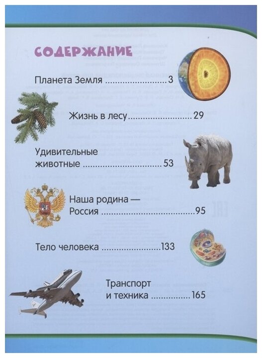 Книга содержит познавательные сведения о планетах Солнечной системы, об удивительных животных со всего мира, о природе, географическом положении, государственных символах и достопримечательностях России, о строении и работе организма человека, о транспорте и технике.