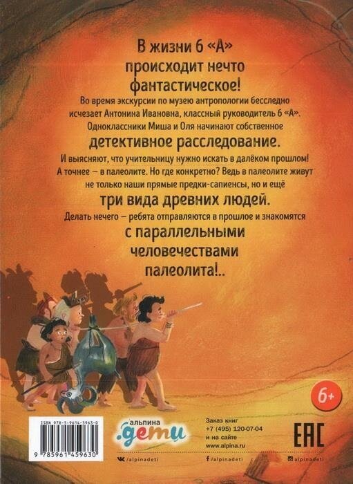 В жизни 6 «А» происходит нечто фантастическое! Во время экскурсии по музею антропологии бесследно исчезает Антонина Ивановна, классный руководитель 6 «А». Одноклассники Миша и Оля начинают собственное детективное расследование. И выясняют, что учительницу нужно искать в далёком прошлом! А точнее — в палеолите. Но где конкретно? Ведь в палеолите живут не только наши прямые предки-сапиенсы, но и ещё три вида древних людей. Делать нечего — ребята отправляются в прошлое и знакомятся с параллельными человечествами палеолита!