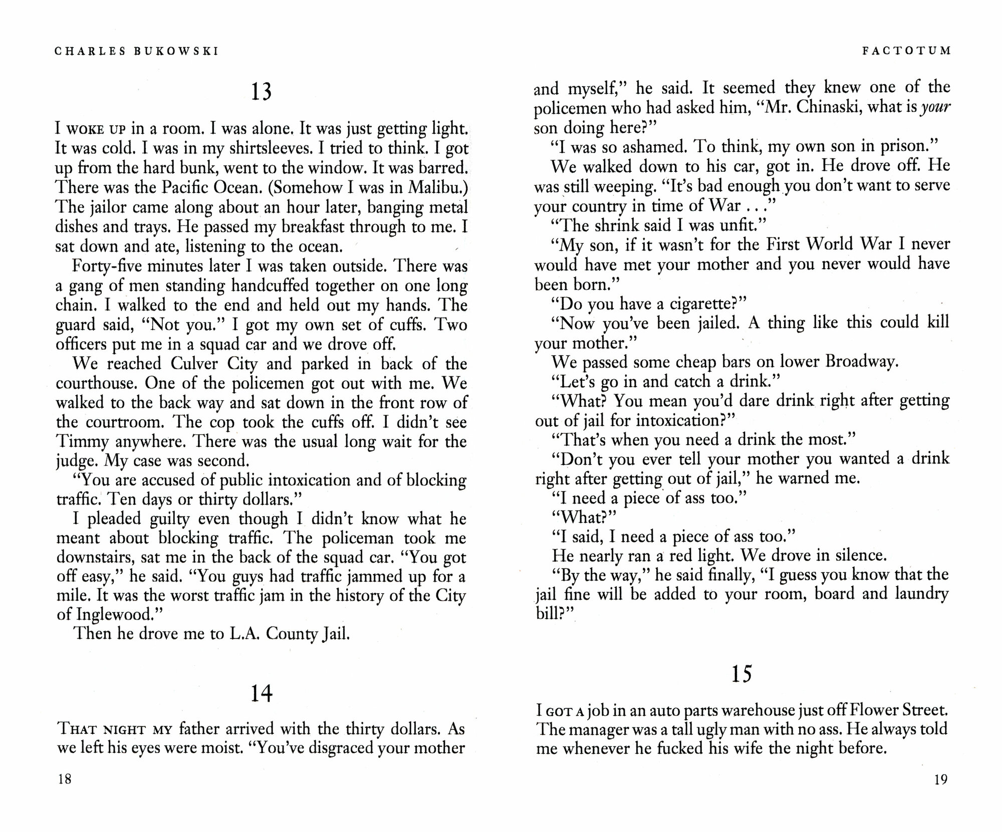 Фактотум - сотрудник, который выполняет все виды работ. Генри Чинаски, альтер-эго Чарльза Буковски, был особым видом фактотума, он работник, который не хотел делать вообще ничего. Скучная работа в скучном мире: его ничего не волновало. Он хотел быть писателем. И он продолжал писать всегда и везде. Он честно рассказал миру, что он за человек и в каком мире он живет, и, несмотря ни на что, стал писателем, одним из самых бескомпромиссных.