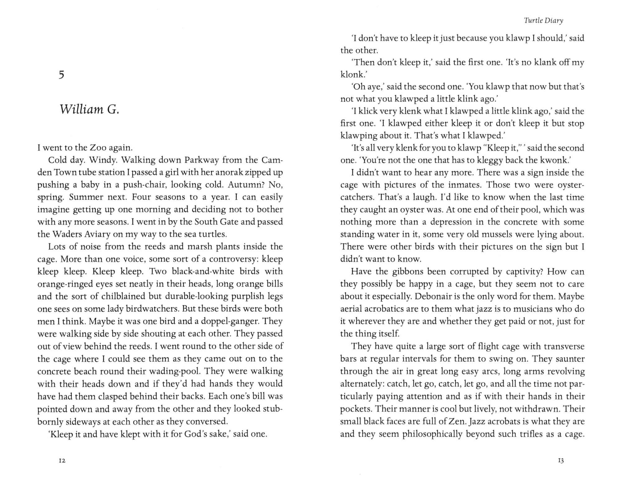 Born to swim thousands of miles in the ocean, the giant sea turtles are now trapped in a tank of golden-green water at London Zoo. But not for much longer. Two lonely people, a bookseller and a children's illustrator, have begun thinking turtle thoughts. As they come together to hatch a plan to release the turtles into the sea, their diaries reveal how they find their own lives changing in imperceptible and quite unintended ways.