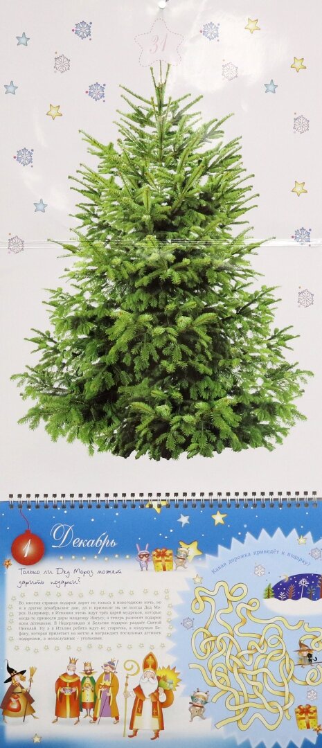 На последней странице нашего календаря вы найдёте наклейки: с их помощью ребёнок сможет нарядить входящую в комплект ёлку.
