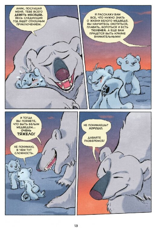 Ну а дальше идет уже ставший привычным рассказ в рисунках о жизни белой медведицы и двух ее медвежат. Брат с сестрой - Аник и Ила достигли возраста, когда медведица начинает учить их охотиться и передает им весь свой опыт. Она рассказывает им все, что знает, экзаменует, спрашивает. Из их диалогов, которые ведутся во время переходов в снегах и льдах, мы узнаем о предках медведей - о прамедведице и немножко о разных видах.