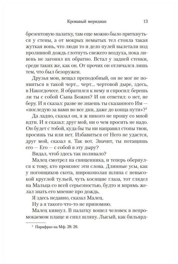 Давно ждал переиздания данной книги. Старые издания уже не найти, но издательство "Азбука" сделало большой подарок всем любителям крепкой современной прозы, хотя роман уже не новый ,но для российского читателя книга обязательная к прочтению. Все дифирамбы из описания оправданы, хотя книга не для всех - не каждый способен выдержать такой накал жестокости и цинизма. То что показано в книге чистая правда ,исторический факт так сказать - и это ужасает. "Кровавый меридиан" вызывает те же ощущения ,что и произведения Алеся Адамовича о ВОВ ,книга "За что сражались советские люди" А. Дюкова и другие жесткие произведения описывающие зверства фашистов. Когда вам будут рассказывать про "светочей демократии" и "сияющий град на холме" ,прочтите данную книгу - вот эти "светочи" ,вот на чьих костях построен тот "град". Автор отлично передает чувство времени, характеры героев, описывает тот исторический период и те места, но это не исторический документ ,а художественное произведение ,в котором автор пытался донести до нас определенные идеи и мысли. Какие ? Прочтите и решите для себя сами. Я же посоветую обязательно приобрести данную книгу в отличном издании в свою домашнюю библиотеку и ... P.S. "Оставь надежду всяк сюда входящий !!!"