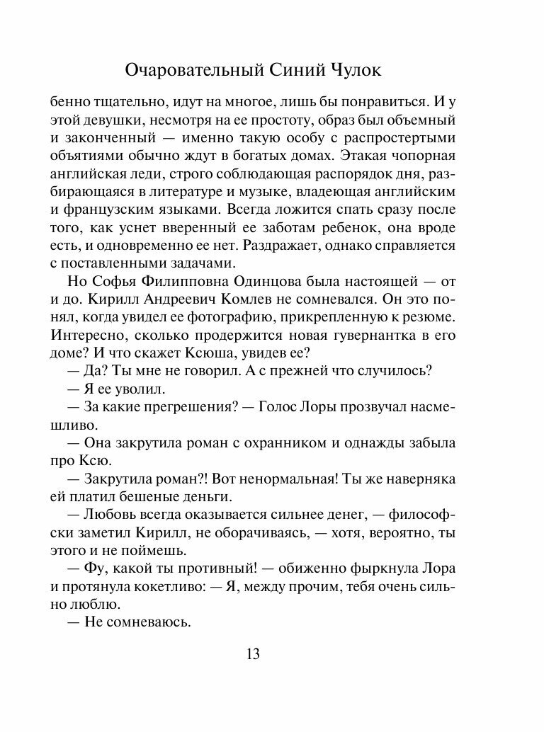 С Юлией Климовой я знакома с 2008 года. Очень нравятся ее произведения. Нежные, легкочитаемые. Книга "Не спеши ее терять" состоит из любовного романа и трёх небольших рассказов. В романе речь пойдет об актрисе Софье Одинцовой, которая устроилась работать гувернанткой в дом Кирилла Андреевича Комлева. Вздорная девочка Ксюша, ее не состоявшееся мачеха Лора, а также бабушка Фаина Григорьевна женские склоки и интриги, все это вы найдете в произведении "Очаровательный синий чулок". В романе есть вторая линия сюжета. Валя и Павел оказались в экстремальной экскурсии. Прыжок с вертолета в океан, джунгли, две ночи в шалаше - все это ожидает Валентину. Как завязана Валентина с новой домработницей и девочкой Ксюшей вы узнаете, прочитав роман Юлии Климовой "Очаровательный синий чулок". Далее мы познакомимся с рассказами "Чудо на каблуках", "Дышите глубже, я рядом" и "Принц неслучайный". Три очень интересные, небольшие истории.