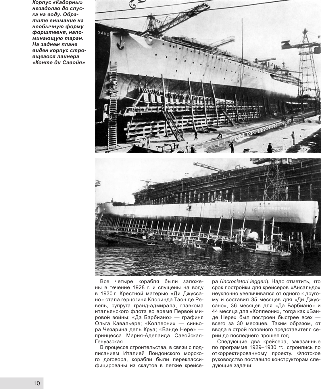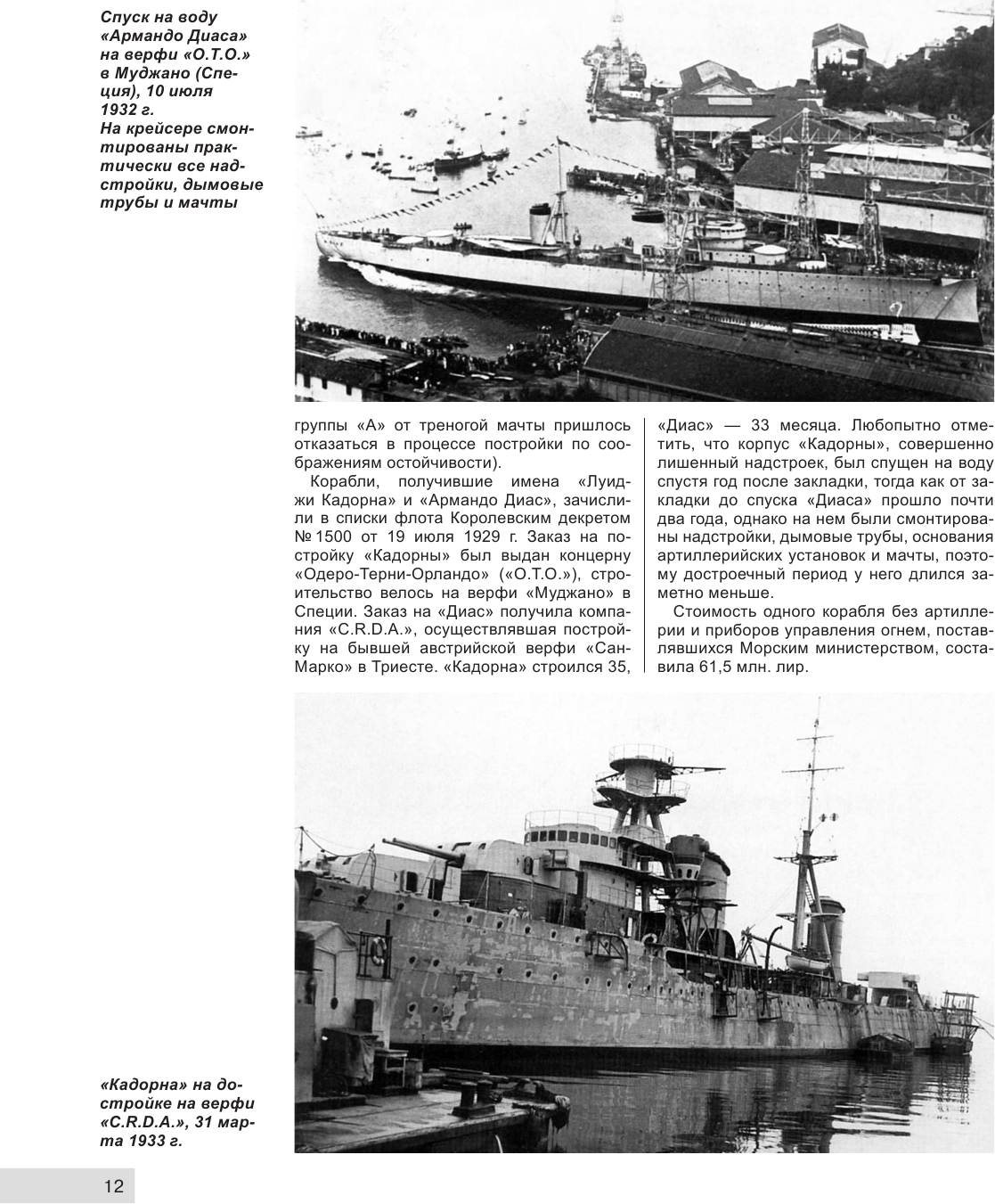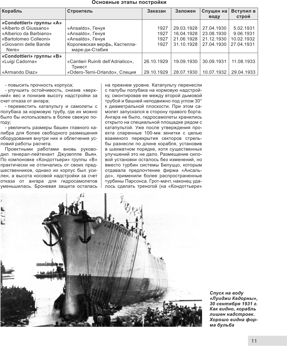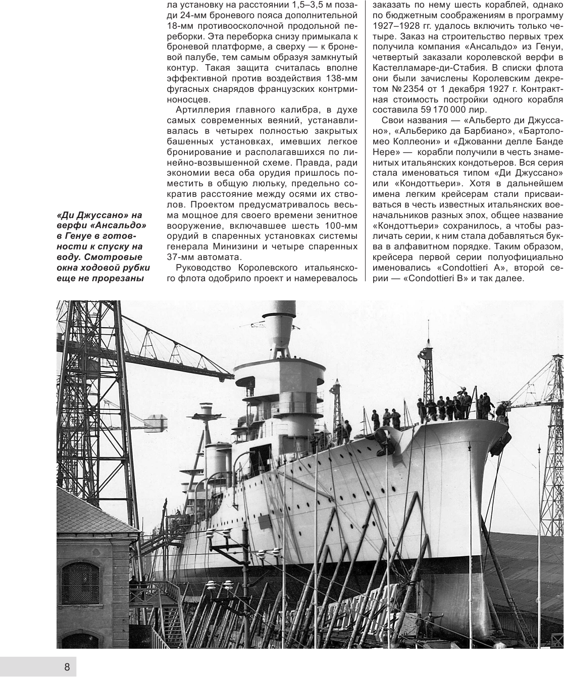 Свои названия - "Альберто ди Джуссано", "Альберико да Барбиано", "Бартоломео Коллеони" и "Джованни делле Банде Нере" - эти легкие крейсера Королевских ВМС Италии (Regia Marina) получили в честь знаменитых итальянских кондотьеров (в XIV-XVI вв. так называли предводителей отрядов наемников). В итоге вся серия стала именоваться типом "Ди Джуссано" или "Кондоттьери" (Condottieri). Хотя в дальнеи?шем имена стали присваиваться в честь известных итальянских военачальников разных эпох, общее название "Кондоттьери" сохранилось, а чтобы различать серии, к ним добавляли букву в алфавитном порядке. Так, креи?сера первои? серии полуофициально именовались Condottieri А, второи? - Condottieri В (к ним относились "Армандо Диас" и "Луиджи Кадорна"). "Кондоттьери" вооружались восемью 6-дюи?мовыми орудиями и при водоизмещении чуть более пяти тысяч тонн имели великолепную скорость, достигая почти 40 узлов при неполнои? нагрузке. Однако ради достижения таких показателей итальянцы пожертвовали прочностью корпуса, броневои? защитои?, мореходностью и запасом топлива. Во Второй мировой эти крейсера участвовали в минных постановках в Средиземном море и проводке конвоев в Северную Африку для итало-немецких войск. Все четыре "Кондоттьери" серии А погибли в боях с британцами в 1940-1942 гг. (два из них потопили эсминцы в ночном бою у берегов Туниса). Из "Кондоттьери" серии В уцелел "Луиджи Кадорна", который после войны союзники оставили в составе итальянских ВМС.