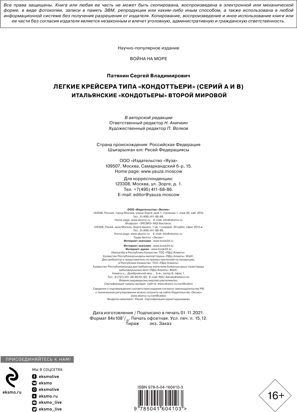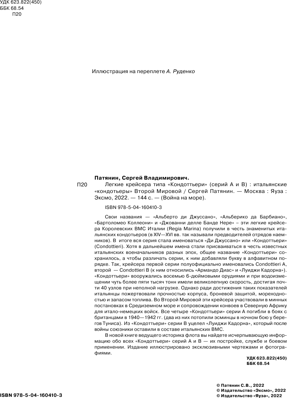 Легкие крейсера типа «Кондоттьери» (серий А и В). Итальянские «кондотьеры» Второй Мировой (Патянин Сергей Владимирович); Эксмо, Редакция 1, 2022
