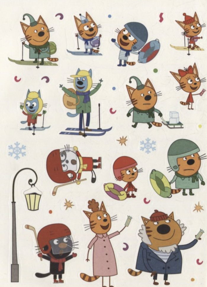 Хотите повеселиться с персонажами мультсериала Три кота? Встречайте Новый год в доме трех котят, отправляйтесь на лыжную прогулку, поиграйте в хоккей и постройте домик из снега. Создавайте свои собственные истории с любимыми героями с помощью многоразовых наклеек.