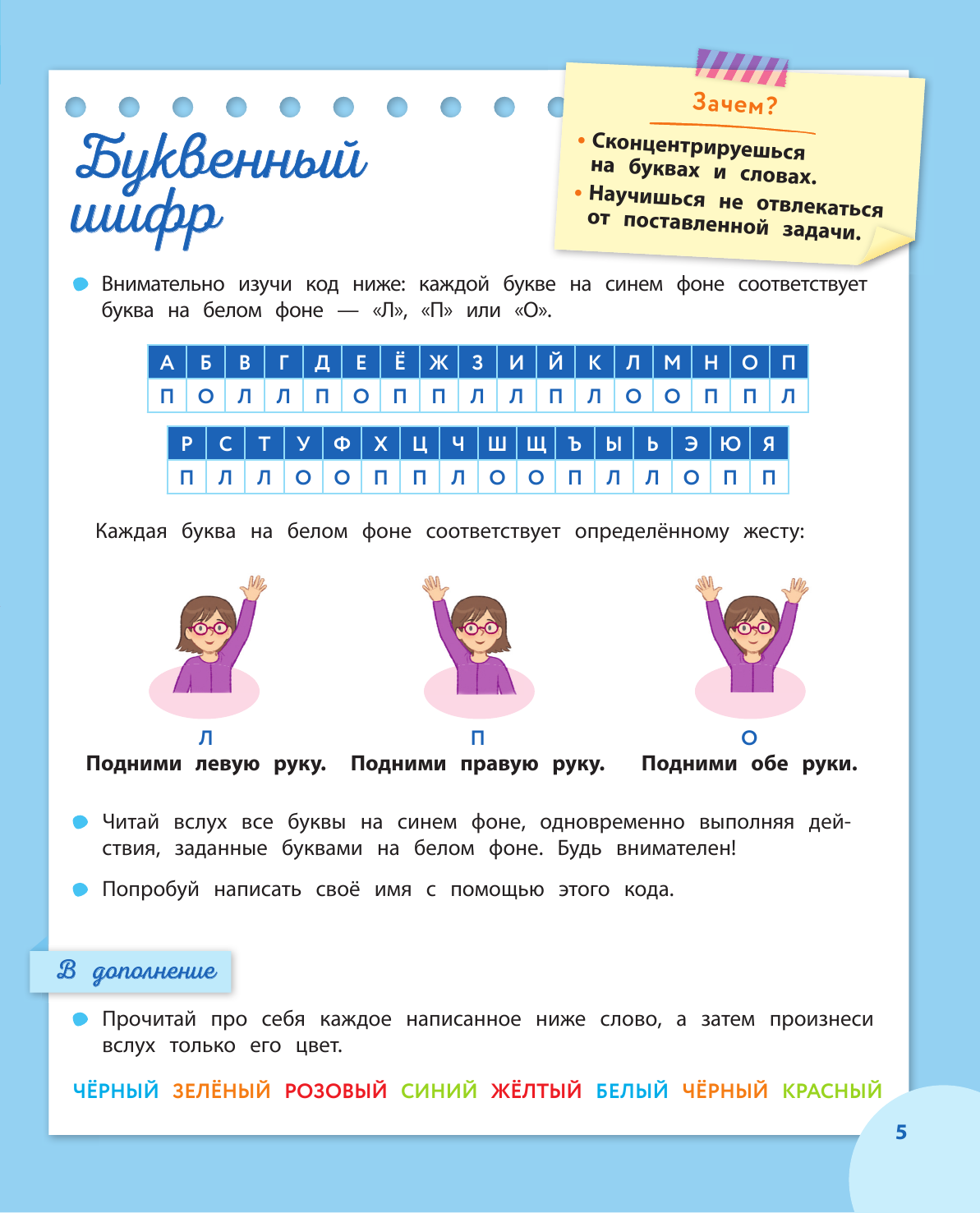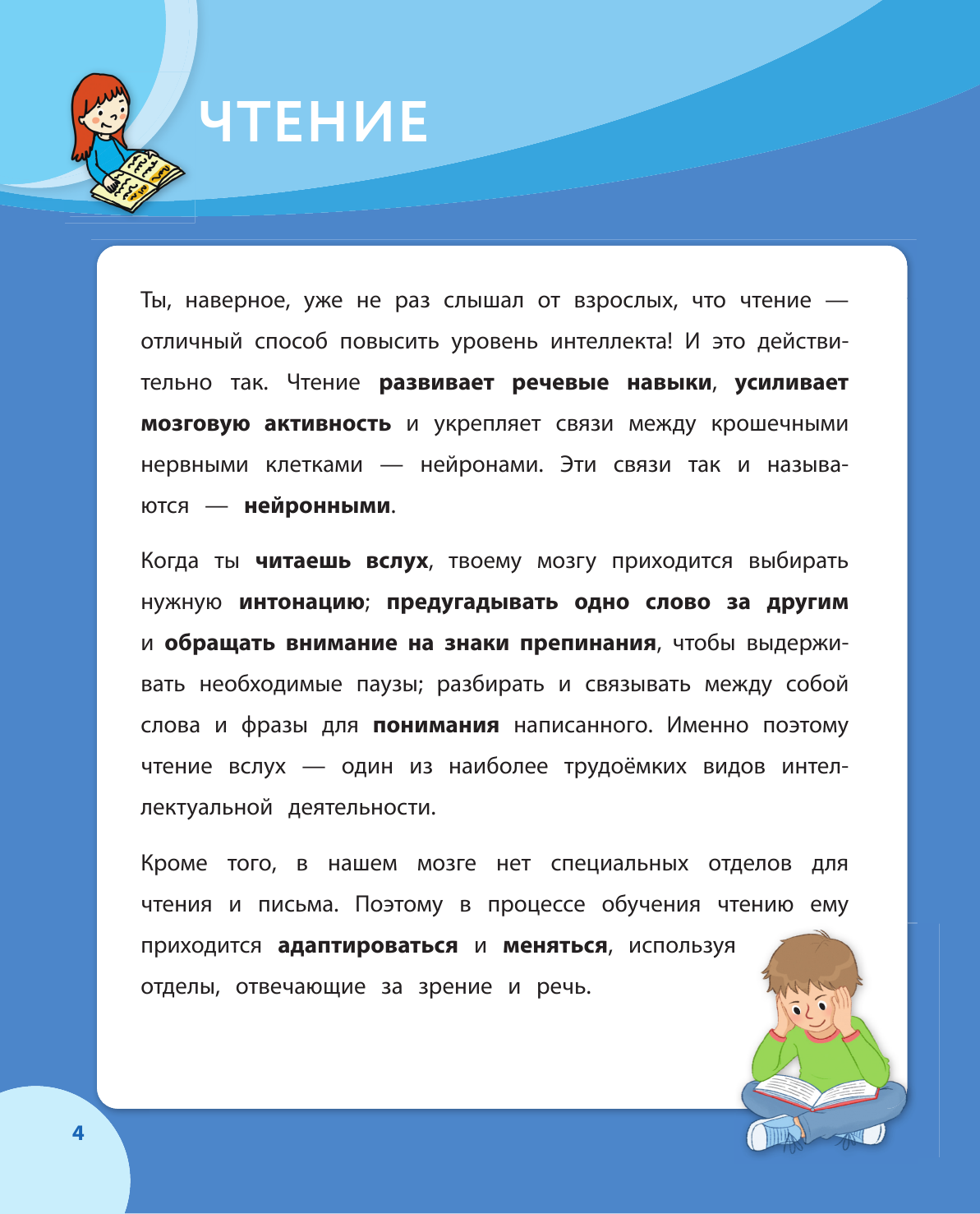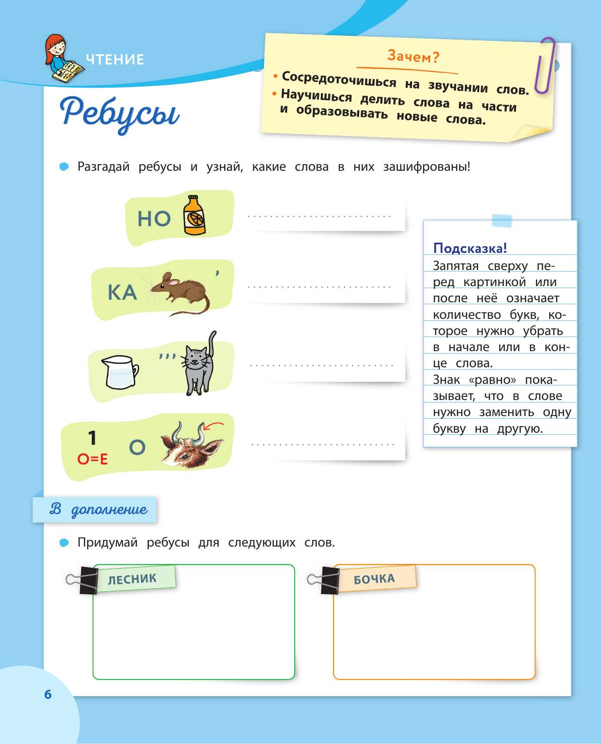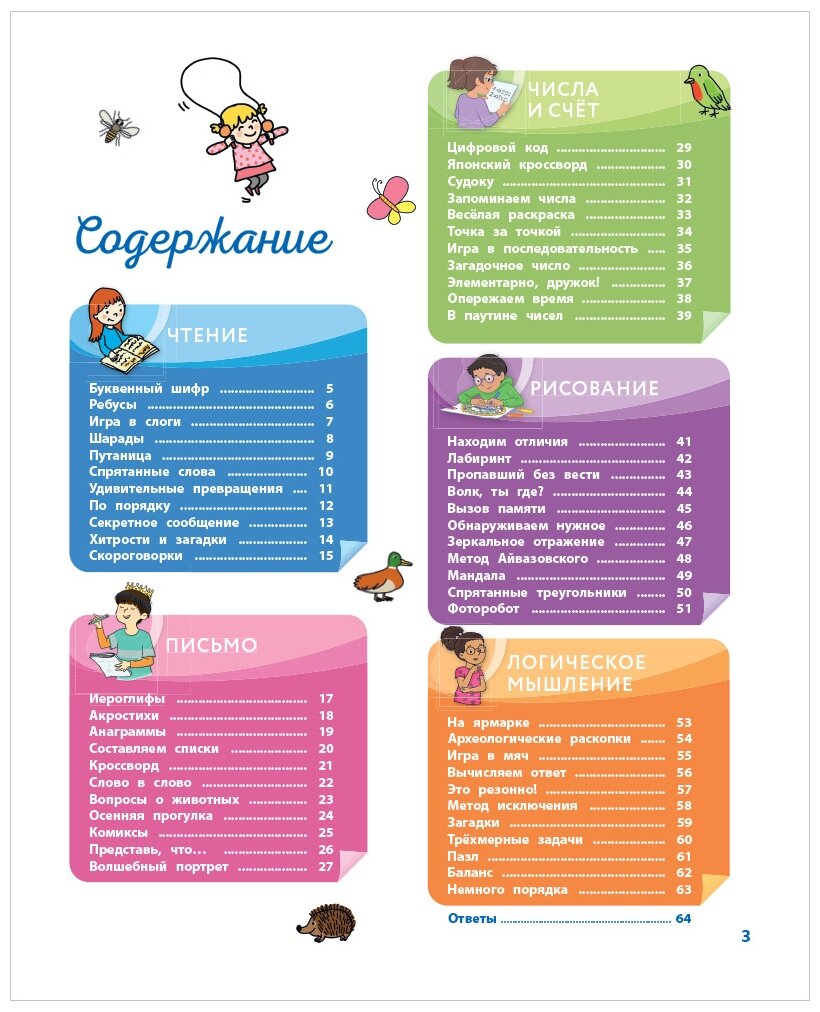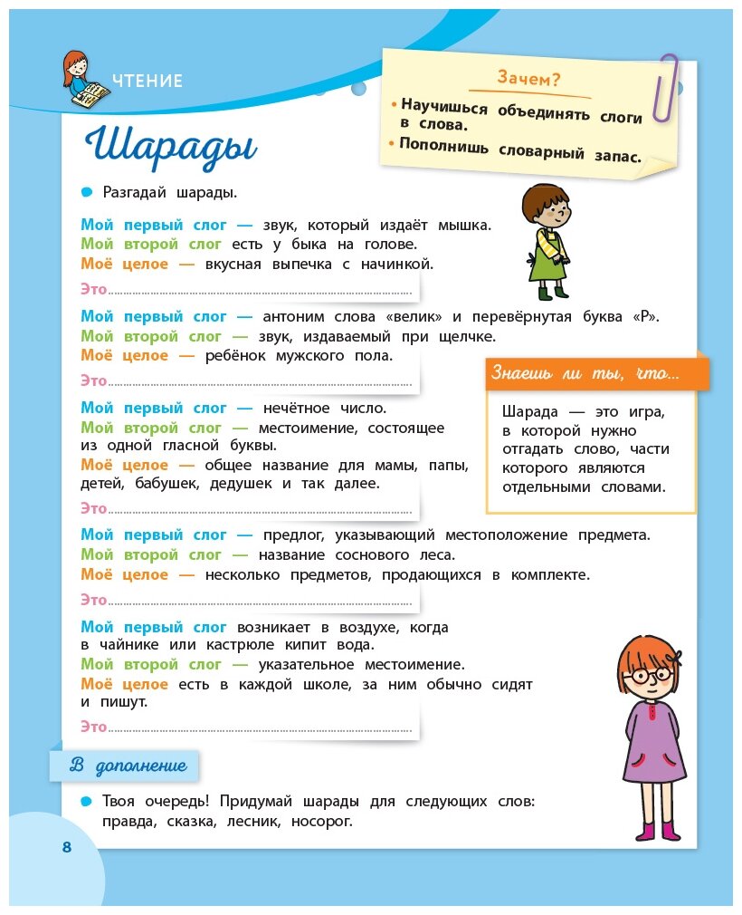 Книга, а точнее, рабочая тетрадочка, мне очень понравилась тем, что является сборником различных заданий и знакомит ребенка практически со всеми наиболее распространенными заданиями (ребусы, шарады, филворды, скороговорки, акростихи, анаграммы, кроссворды, судоку, зеркальное отражение и прочее). Каждому виду задания посвящена страничка, на которой есть "подсказка", поясняющая, что называется шарадой (или прочее понятие), и текст, объясняющий зачем нужно выполнять данное упражнение. В начале каждой из 5 глав также есть пояснение почему полезно читать вслух, например. В конце приведены ответы.