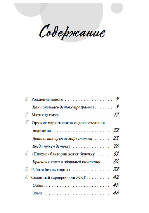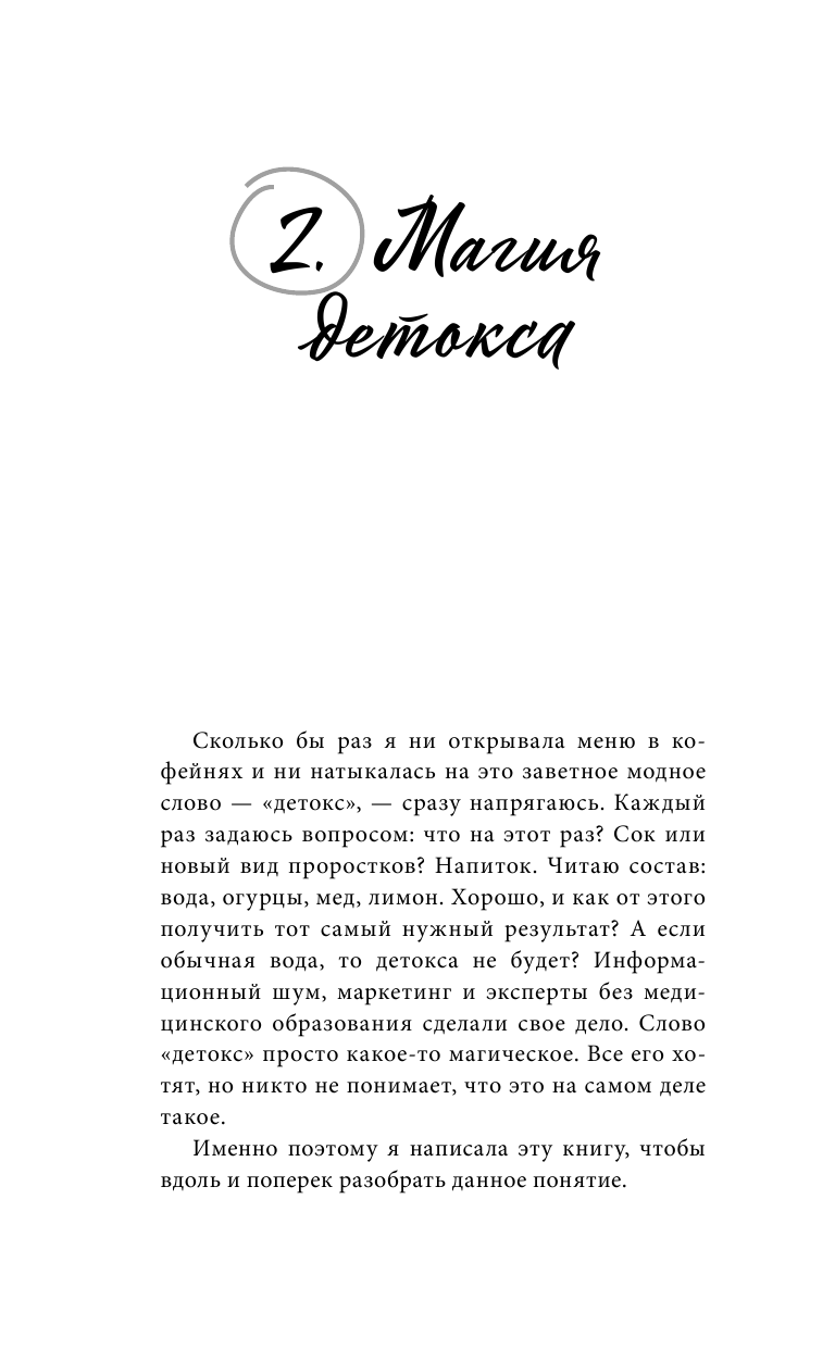 О чём же книга? «Это книга о детоксе в бытовом понимании слова – о легкой перезагрузке с подробным пошаговым планом на каждый сезон. Кто хочет «почистить печень» – тому книга не подойдет. А тем, кто хочет облегчить жизнь организму, снизить вес с пользой для здоровья, помочь ЖКТ работать лучше, очистить вкусовые рецепторы, избавиться от тяги к сладкому, от отеков, – книга поможет.»