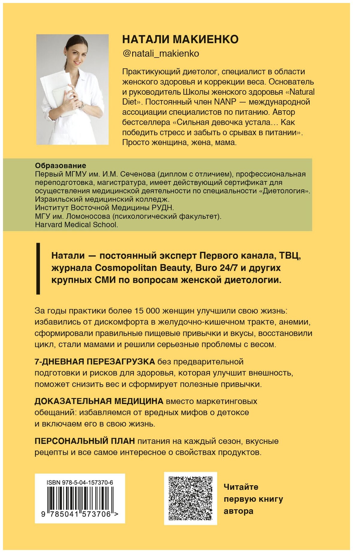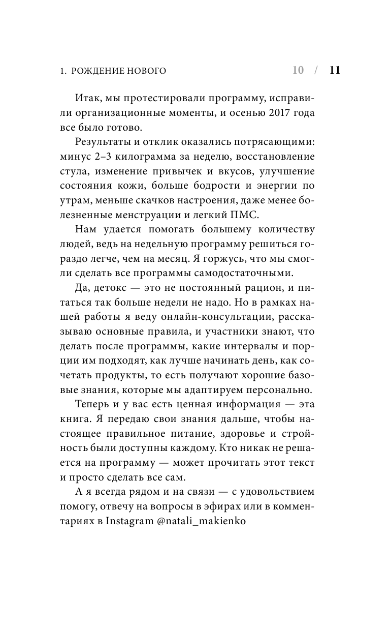 Бесспорно, в книге Натали упоминает и собственные программы - «Детокс» и «Осознанное питание». Скажете: ради рекламы. Возможно, и так, но всё же ненавязчиво и ради вдохновения читателей. А как не вдохновиться описанными результатами и чудесными историями Женщин, проложивших свой путь в питании при наставничестве Натали?
