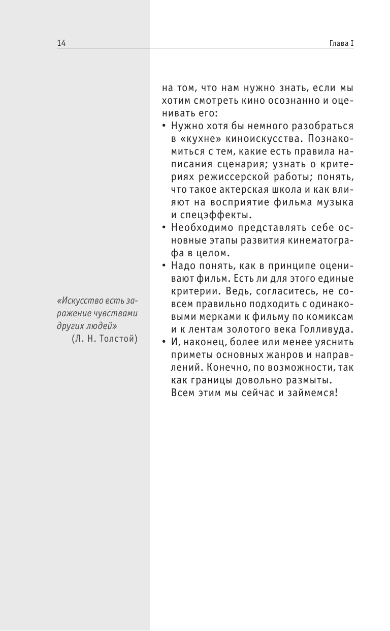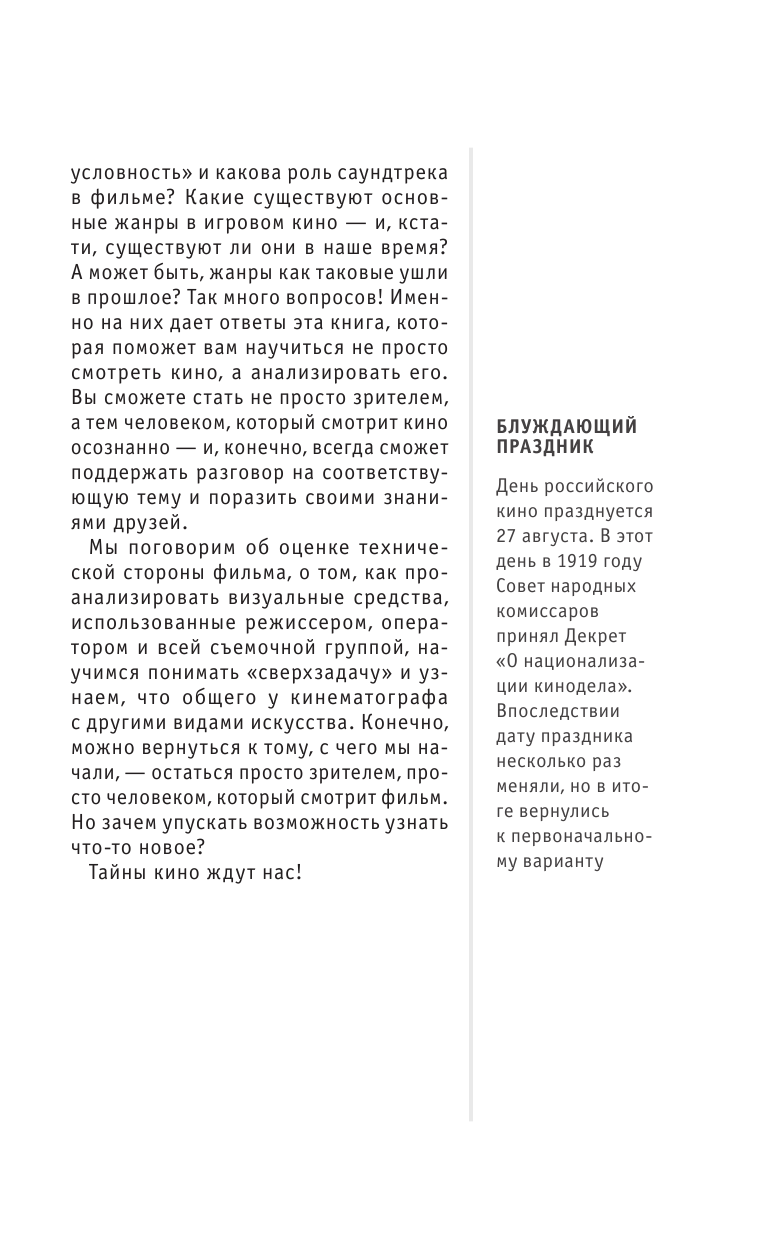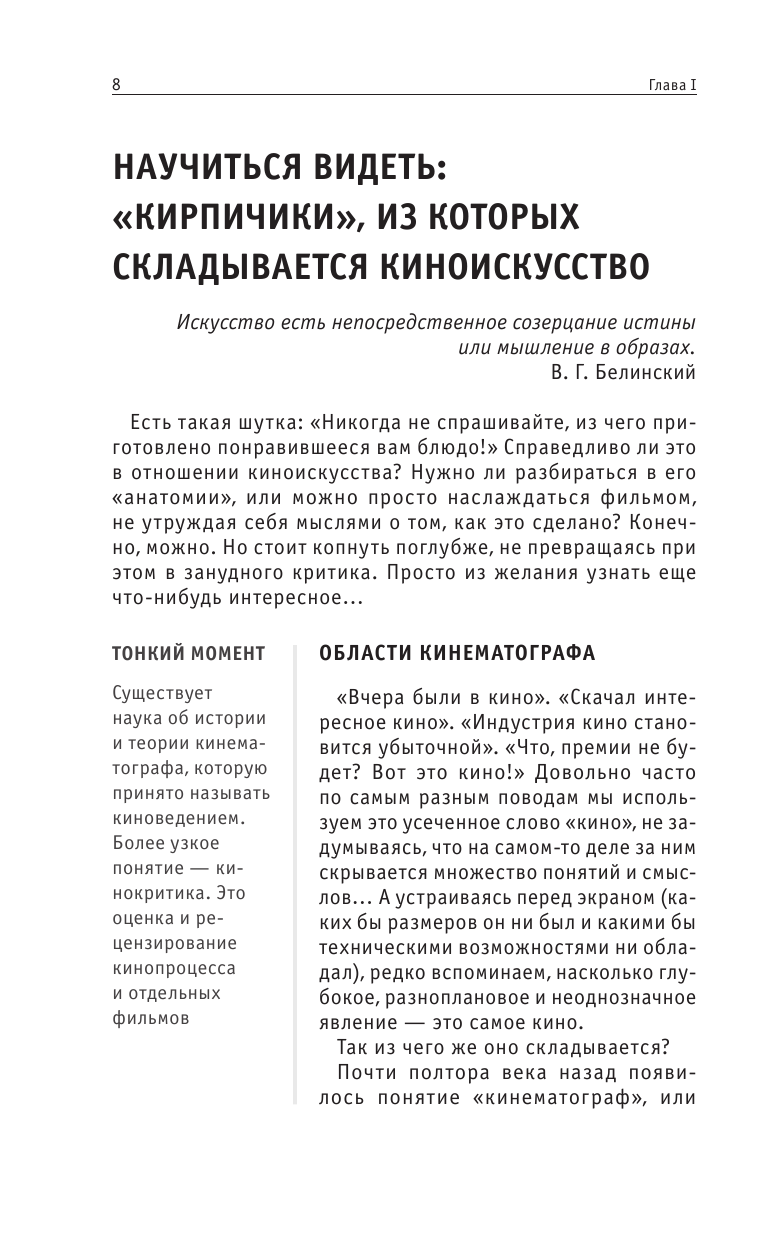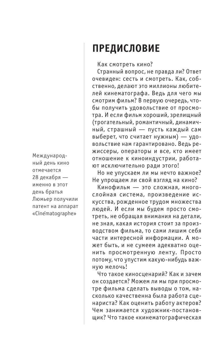 Данная книга представляет собой учебник по пониманию самого кино и кинопроизводства в целом. В ней подробно рассказывает автор как надо смотреть кино, на что обращать внимание. Эта книга будет интересна всем любителям хорошего кино и людям, которые хотят выбрать себе профессию, связанную с кинематографом. Я советую данную книгу для покупки.
