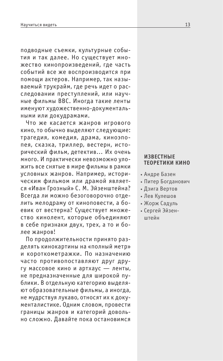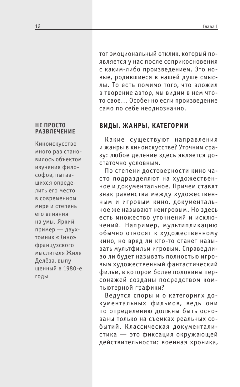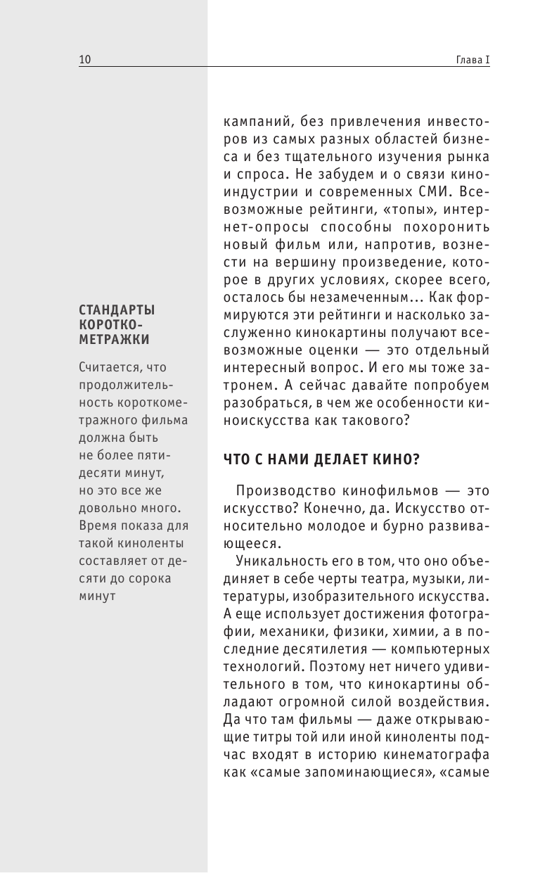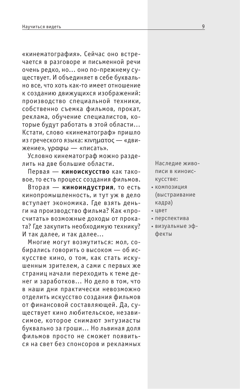 Данная книга представляет собой учебник по пониманию самого кино и кинопроизводства в целом. В ней подробно рассказывает автор как надо смотреть кино, на что обращать внимание. Эта книга будет интересна всем любителям хорошего кино и людям, которые хотят выбрать себе профессию, связанную с кинематографом. Я советую данную книгу для покупки.