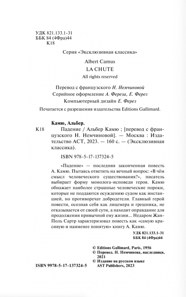 Книга: Падение (Альбер Камю); Издательство АСТ, 1956