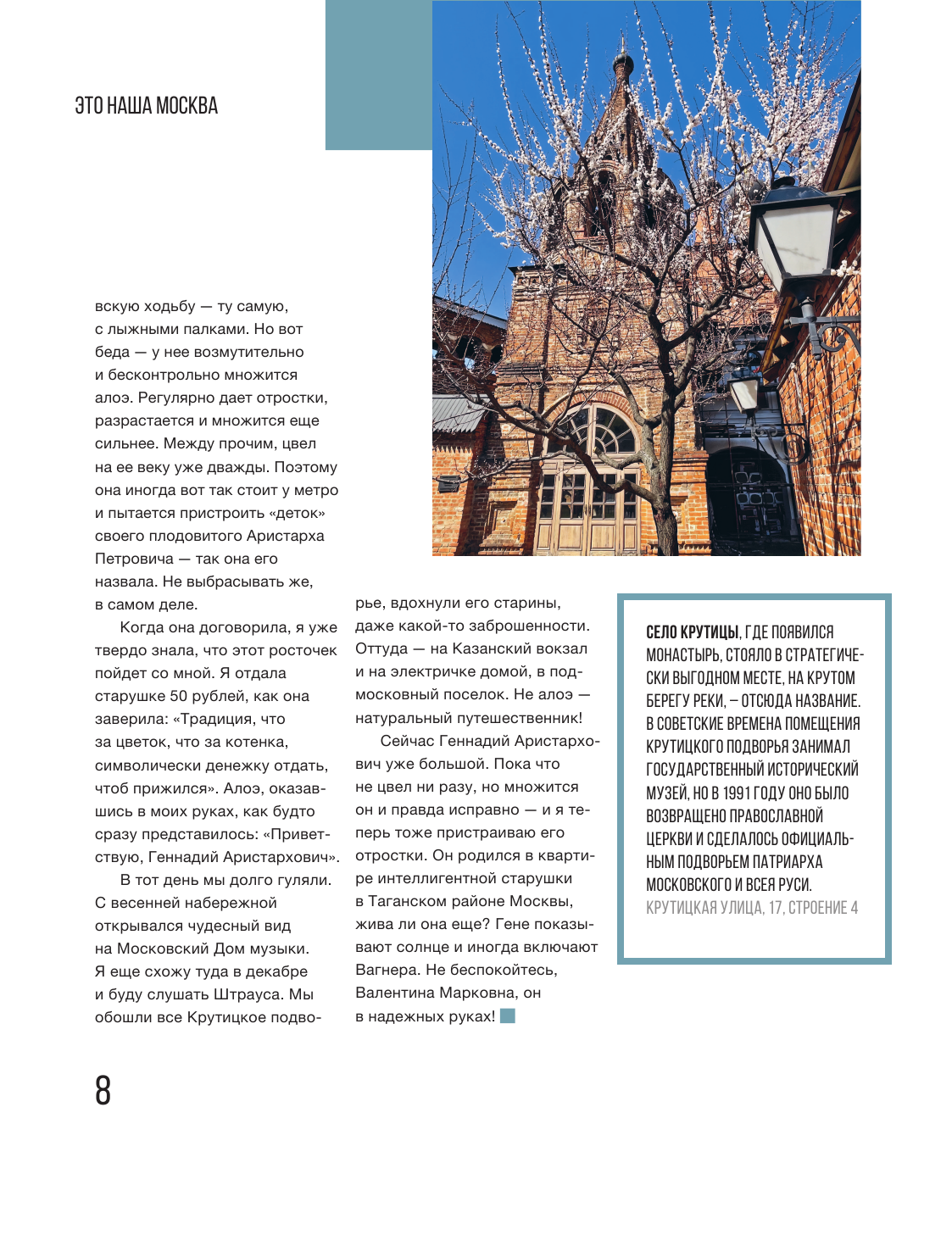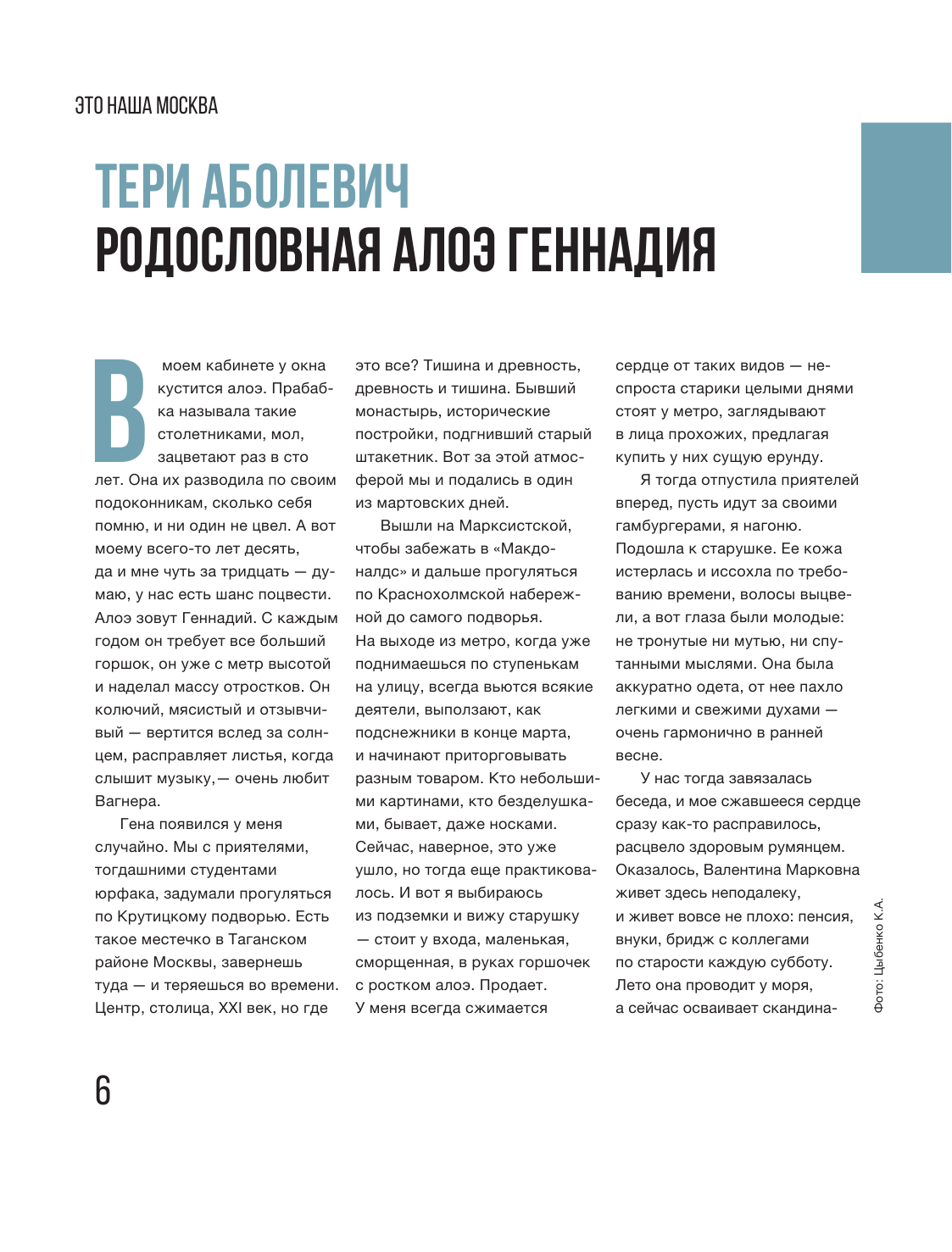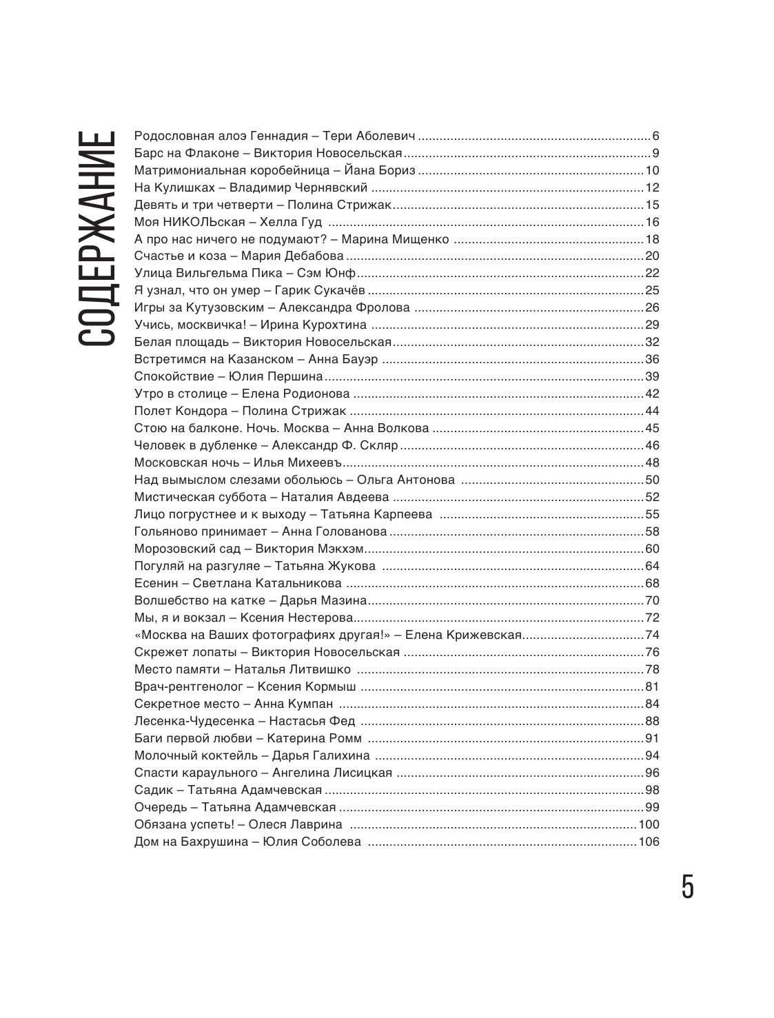 Вместе с авторами рассказов вы прогуляетесь по столичным вокзалам и станциям метро, вспомните, какой была Никольская во время Чемпионата Мира по футболу, попробуете выбраться из заколдованного Ботанического сада, встретите Высоцкого зимним вечером, отдохнете на диких берегах Москвы-реки с видом на высотки Сити и приютите алоэ Геннадия, купленного у почтенной старушки в Таганском районе.