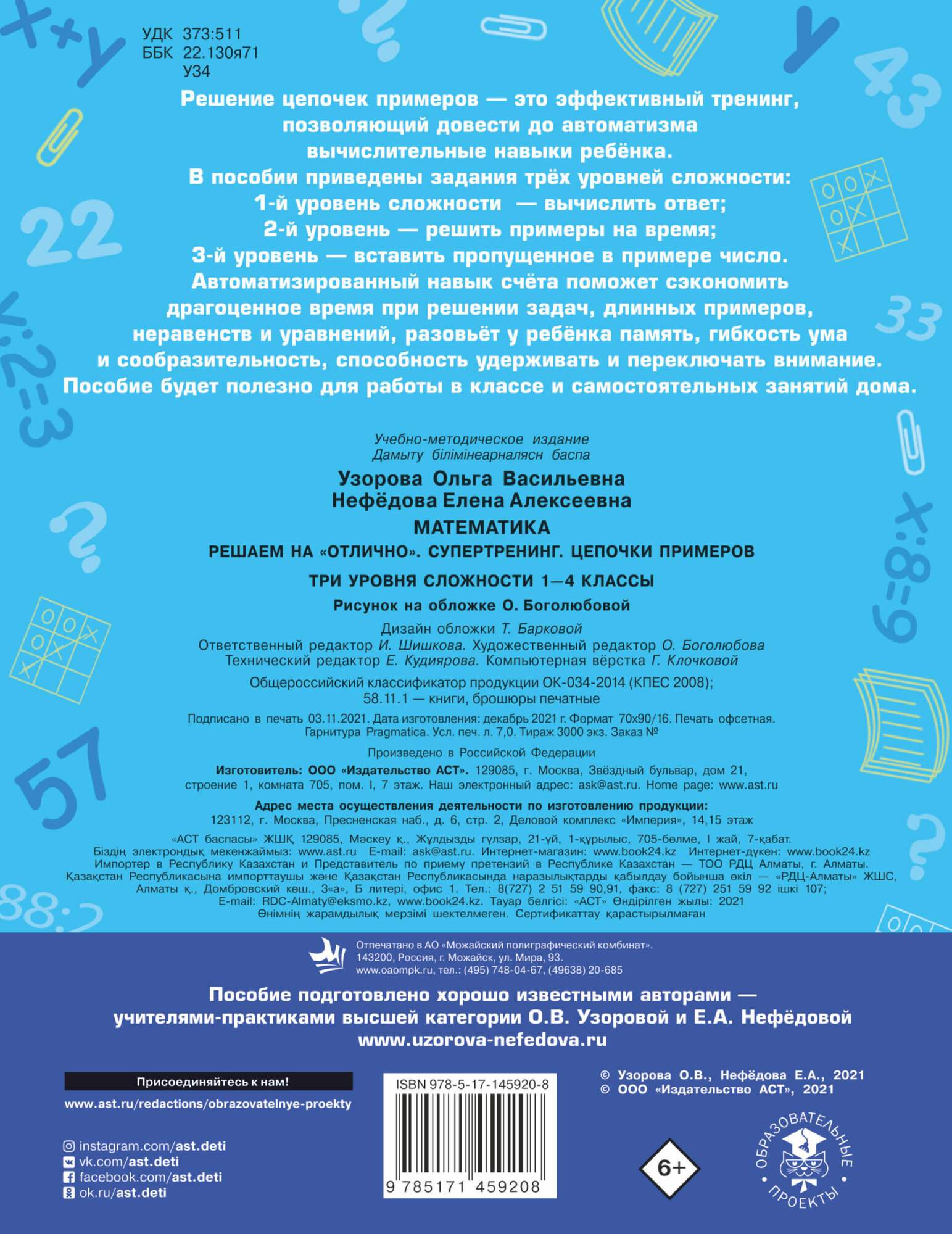 Математика. Решаем на "отлично". Супертренинг. Цепочки примеров. Три уровня сложности. 1-4 классы (Узорова Ольга Васильевна; Нефёдова Елена Алексеевна); ИЗДАТЕЛЬСТВО "АСТ", 2021