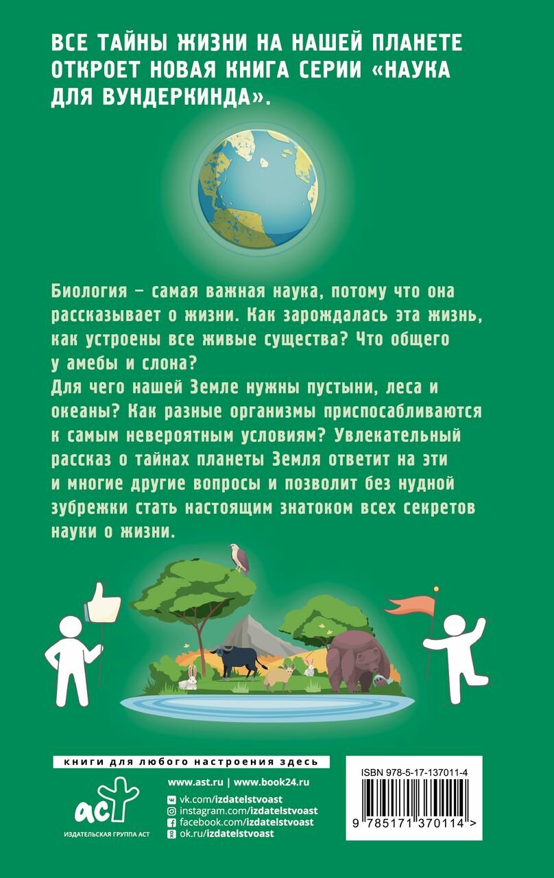 Книга из серии Наука для вундеркиндов.Издательство АСТ.Книга в твердом переплете,крупный,удобный для чтения шрифт.Много иллюстраций.В популярной и познавательной форме рассмотрены все вопросы науки о жизни.Много исторических фактов и примеров из окружающего мира.Книга хорошо систематизирована,после каждого раздела делаются основные выводы.Книга полезна как для детей,так и для родителей.Рекомендую.