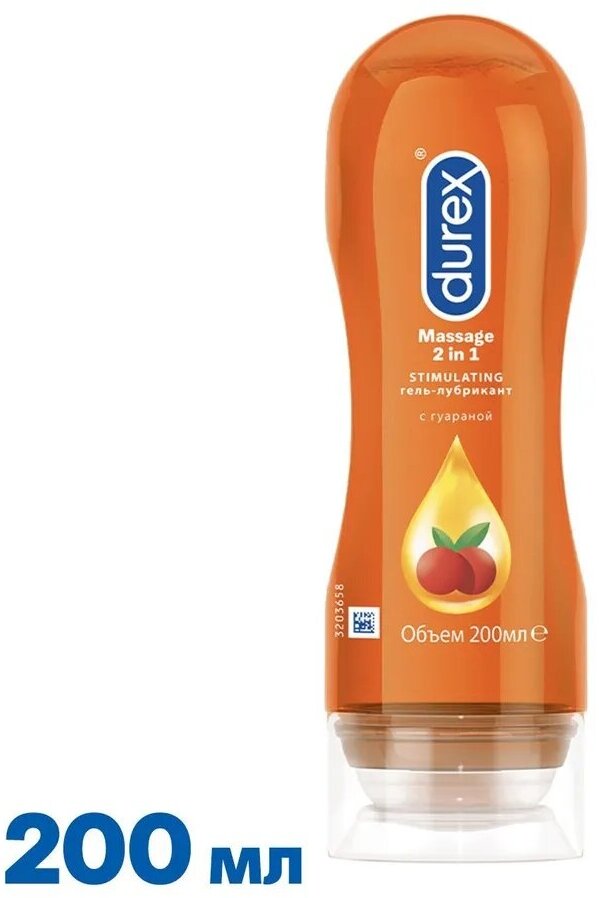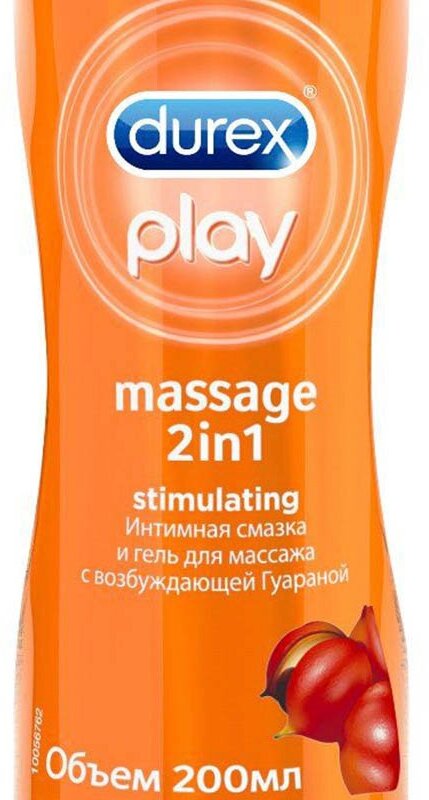 Гель-лубрикант Durex® Massage 2 in 1 Stimulating’ – это гель с гуараной, который прекрасно подходит как для увлажнения интимных областей, так и для деликатного массажа всего тела. Подходит для вагинального, анального и орального секса. Сделайте секс более приятным! 9 из 10 согласны, что секс с гелем лучше*. ’Массаж 2 в 1 Стимулирующий. *В соответствии с результатами маркетингового исследования «Интимные гели, лубриканты», проведенного ООО «Тибурон» в 2016 году.