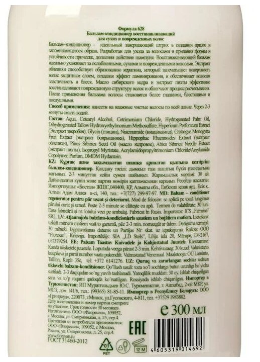 Флоресан Бальзам-кондиционер Восстанавливающий 300 мл. Бальзам-кондиционер - это идеальный завершающий штрих в создании яркого и запоминающегося образа. Разработан для ухода за волосами и придания формы и устойчивости прическе, дополняя действие шампуня. Восстанавливающий бальзам идеально ухаживает за ослабленными, сухими и поврежденными волосами. Экстракт облепихи способствует образованию кератина, который запечатывает поверхность волос защитным слоем, создавая эффект ламинирования, и обеспечивает волосам эластичность и блеск. Масло сибирского кедра и экстракт пихты эффективно восстанавливают поврежденную структуру волос и облегчают процесс расчесывания. После применения бальзама волосы становятся более гладкими, блестящими и послушными. Способ применения: нанести на влажные чистые волосы по всей длине. Через 2-3 минуты смыть водой.
