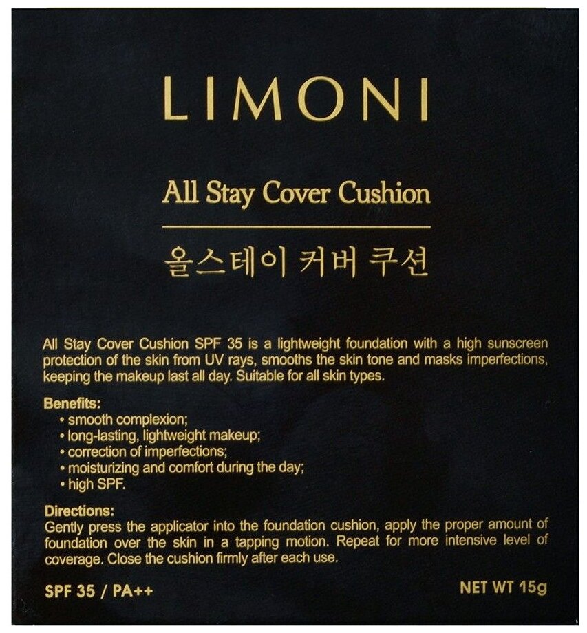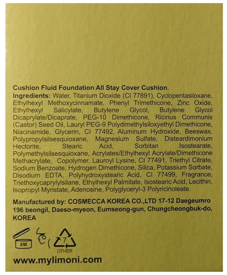 Тональный флюид-кушон All Stay Cover Cushion — тональное средство с легчайшей текстурой, которая создает эффект идеально ровной, чистой и нежной кожи. Уникальный состав формулы кушона ухаживает за Вашей кожей, сохраняя ее красоту. Увлажняющий гель заполняет морщинки и неровности, создавая на поверхности кожи защитную пленку, которая предотвращает потерю влаги. Это позволяет сохранить макияж в течение всего дня. Благодаря высокому индексу SPF, флюид надежно защищает от солнца. Стойкое, комфортное средство ложится тонкой вуалью.В состав флюид-кушона All Stay Cover Cushion входит аминокислота Лаурил Лизин, которая активизирует обменные процессы, регулируетработу сальных желез, предупреждает появление жирного блеска и предотвращает появление липкой пленки.Как использоватьНаносить кушон на подготовленную увлажненную кожу лица с помощью мелкопористого спонжа. Для создания естественного тона лица наносить флюид распределяющими движениями по массажным линиям, от центра лица к периферии. Для более ровного и стойкого тона лица наносить флюид похлопывающими движениями. Степень плотности покрытия регулировать по необходимости.