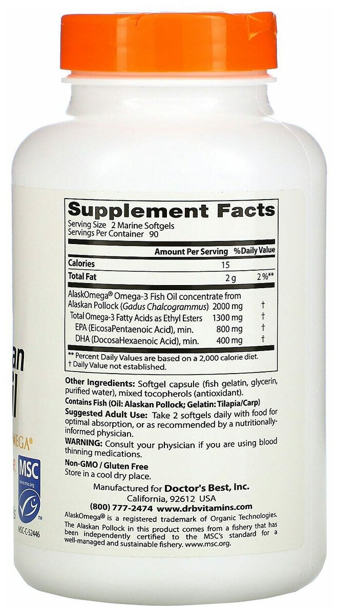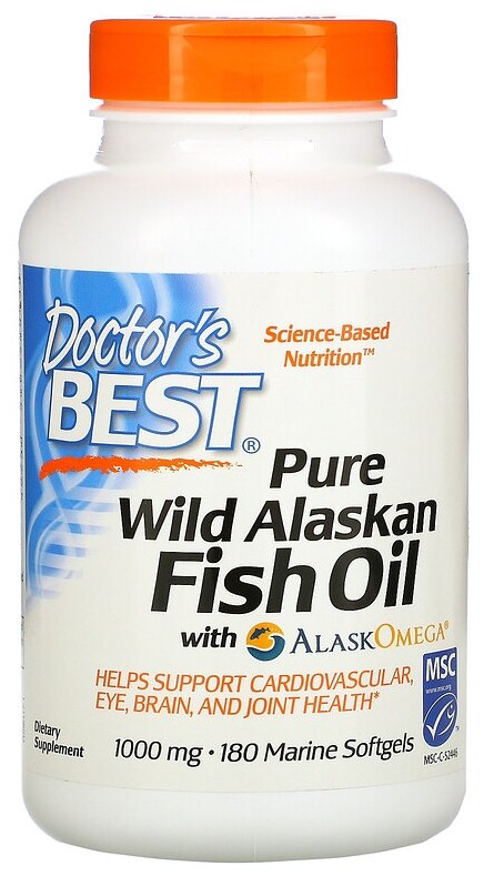 Чистый жир дикой аляскинской рыбы от Doctor’s Best с AlaskOmega содержит концентрированный рыбий жир из экологически чистого дикого аляскинского минтая. Рыбий жир AlaskOmega производится в течение нескольких часов после того, как его доставят на борт морские уловы-переработчики или местные береговые переработчики. Масло подвергается молекулярной дистилляции, что обеспечивает максимальную чистоту, эффективность и очень низкое значение Totox. Totox является индикатором свежести морского масла, и чем ниже значение, тем лучше качество. Процесс очистки обеспечивает чрезвычайно низкое окисление масла для оптимальных сенсорных характеристик и чистого вкуса. Этот рыбий жир Аляски содержит 800 мг EPA и 400 мкг DHA на порцию. Общие жирные кислоты Омега-3 поддерживают здоровье сердца, суставов, глаз и мозга.