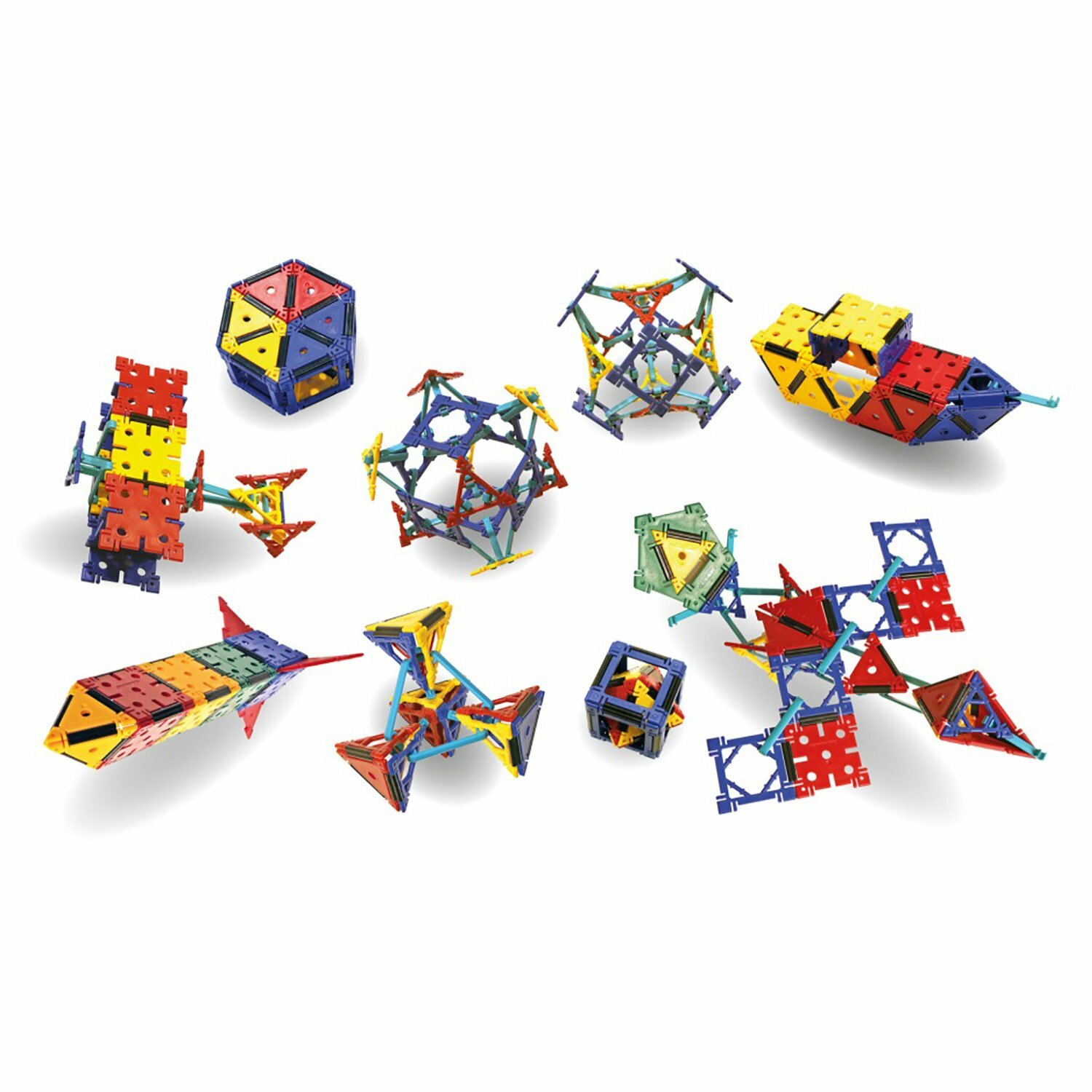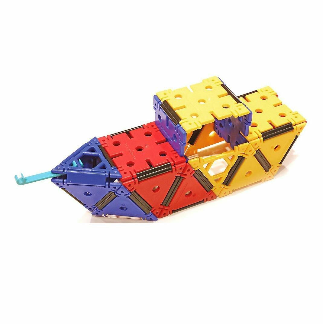 Набор содержит 102 детали и красочную инструкцию с подробным описанием сборки 43 проектов. В инструкции можно будет найти и образовательную часть, знакомящую ребёнка с основами геометрии.