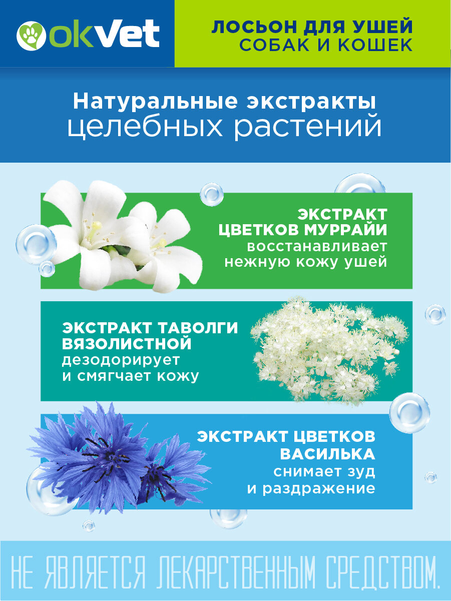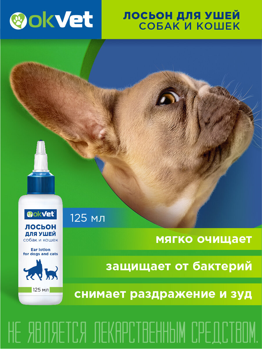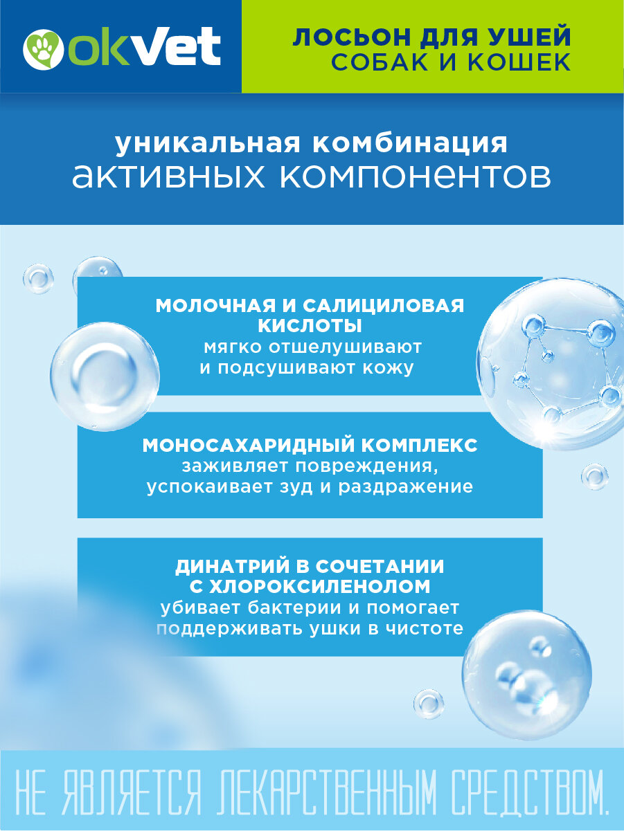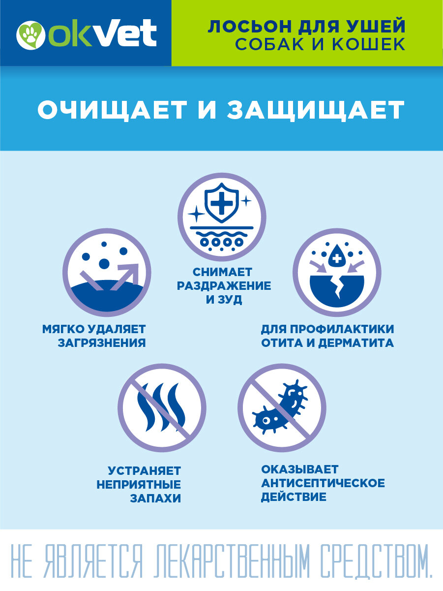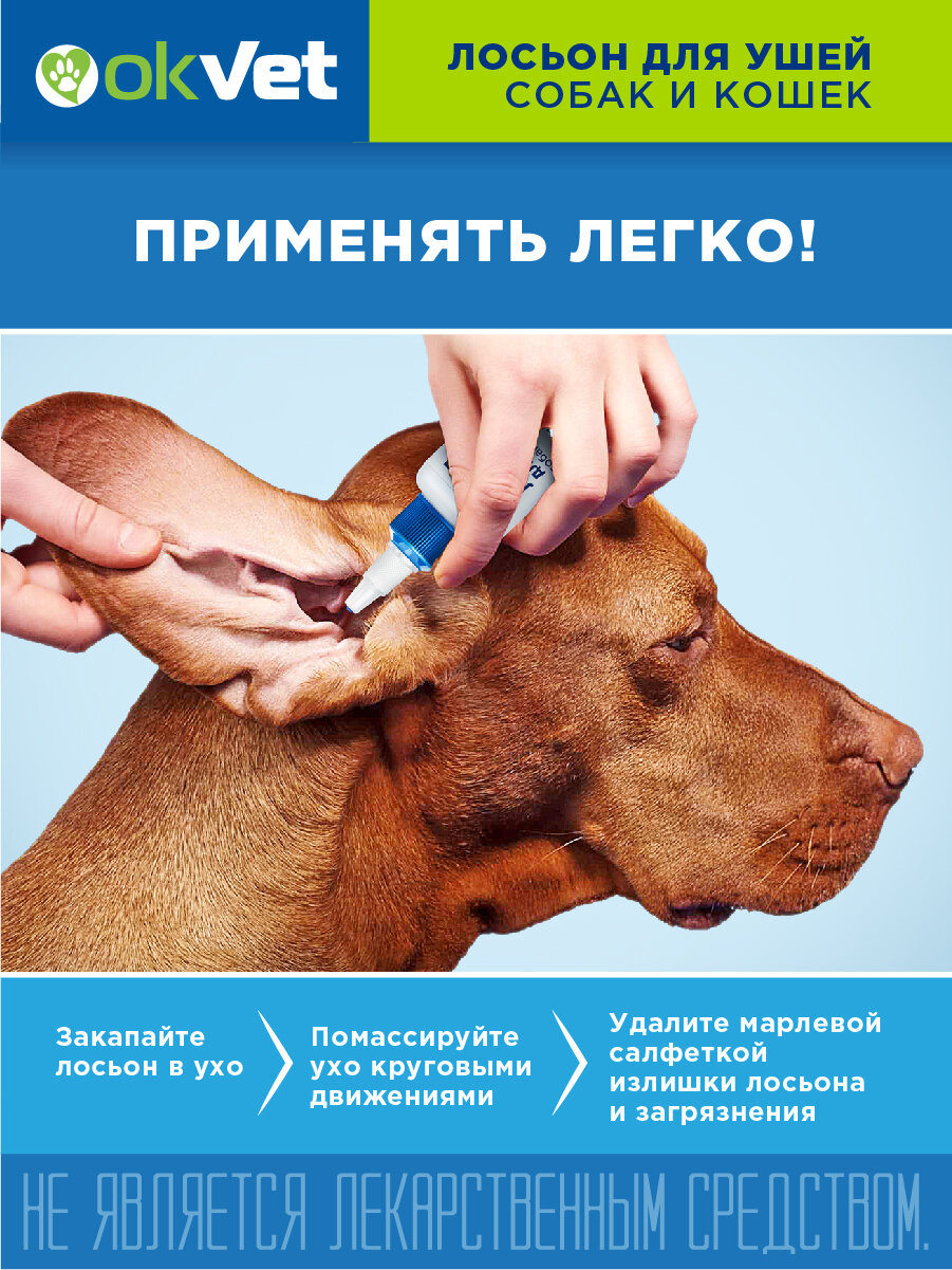 ОKVЕТ® лосьон для ушей эффективно устраняет ушную серу, неприятный запах, загрязнения ушной раковины и слухового прохода.