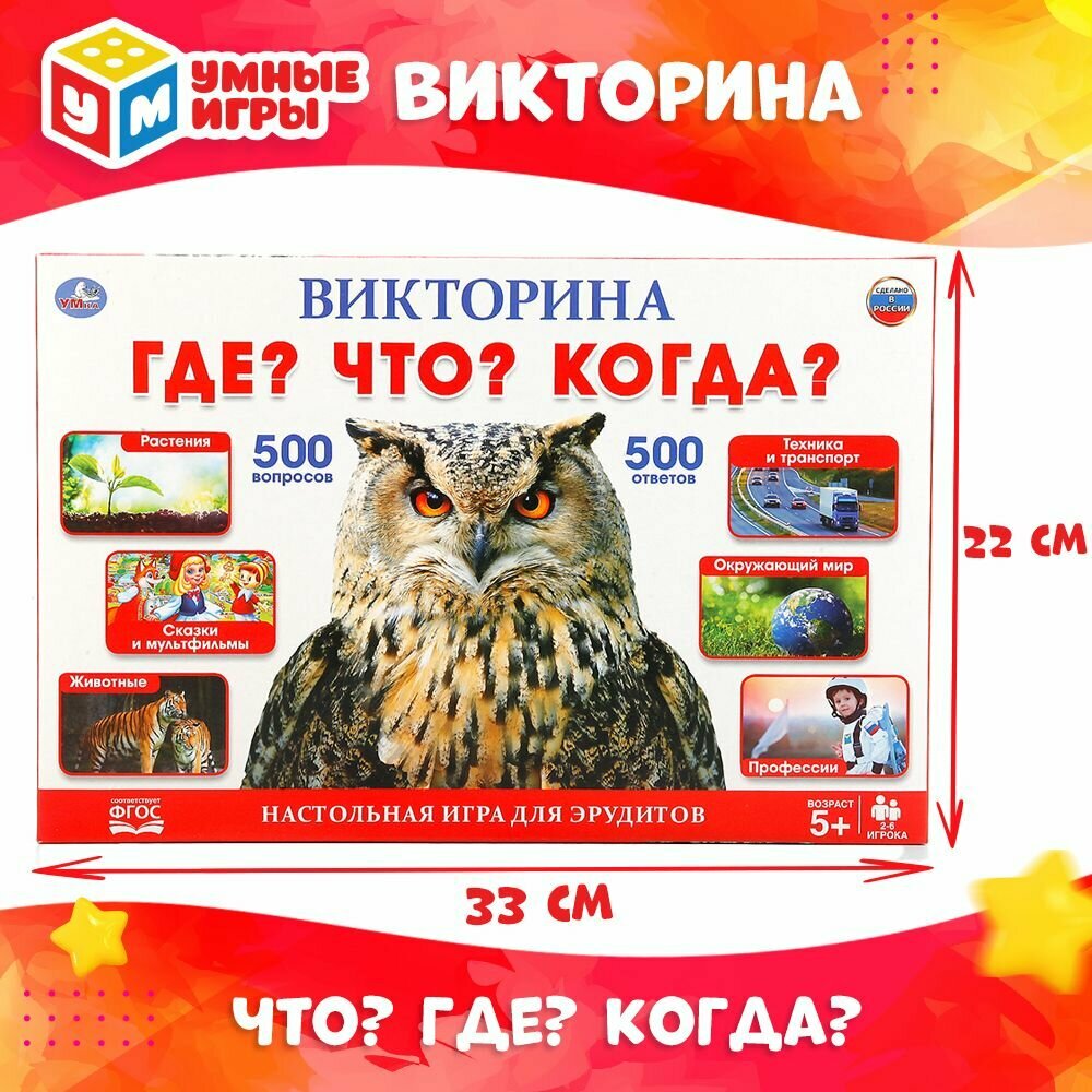 Викторина «Что? Где? Когда?» ТМ «Умные игры» - увлекательное обучение в виде игры.Особенности и комплектация:- 500 вопросов- 500 ответов- игровое поле с 6 различными темами: «Растения», «Сказки и мультфильмы», «Животные», «Техника и транспорт», «Окружающий мир», «Профессии»- для 2-6 игроков- правила игрыВ ходе игры все участники отвечают на разнообразные вопросы с карточек, относящихся к той или иной теме. Тема вопросов определяется стрелкой на игровом поле. С такой занимательной викториной и героями любимого мультсериала ребёнок сможет весело и с пользой провести время в компании родителей или друзей, получая при этом новые знания.Викторина ТМ «Умные игры» развивает:- кругозор- внимание- усидчивость- памятьРазмер: 3 x 33 x 22 см. Материал: картон + пластмасса.Рекомендовано детям от 5-ти лет.
