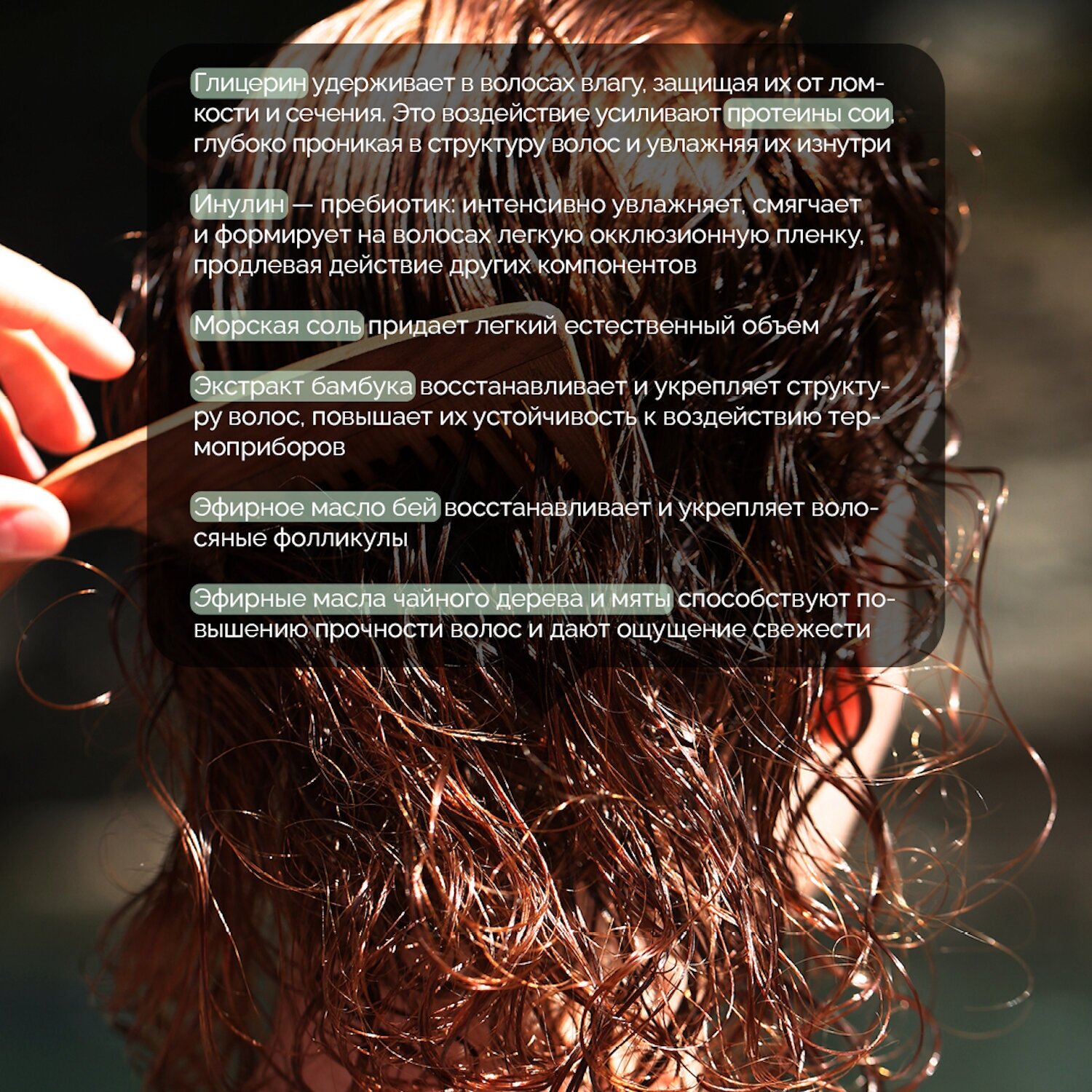 Облегчает расчесывание и укладку за счет разглаживания поверхности волос. Экстракт бамбука улучшает структуру волос, обеспечивает защиту во время укладки, предотвращает сухость кожи головы. Эфирное масло бей восстанавливает и укрепляет волосяные фолликулы и активизирует процесс роста волос. Эфирные масла чайного дерева и мяты защищают волосы от негативных факторов окружающей среды, способствуют повышению их прочности регулируют работу сальных желез, дают ощущение свежести и нежный аромат.