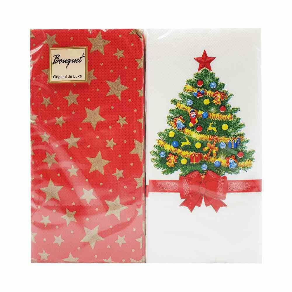 Салфетки одноразовые бумажные двухслойные. Размер 33х33СМ. Упаковка 20шт. Уникальное вложение в пачке - 2 разных расцветки сложены и красиво упакованы. Тематический дизайн: новогодняя ель со звездами.