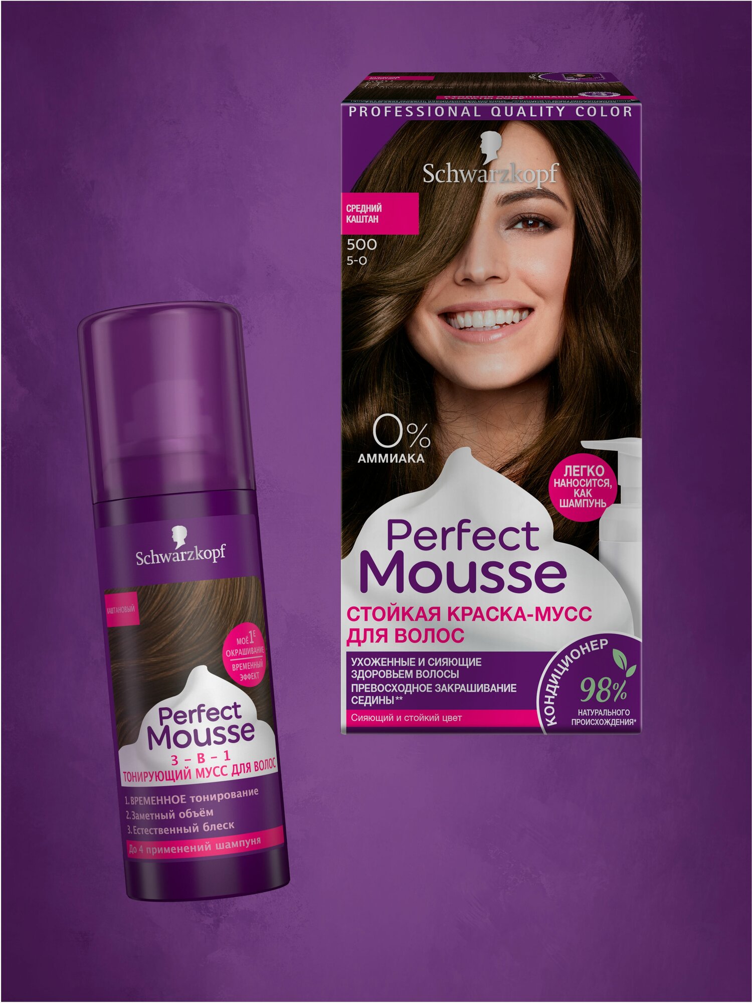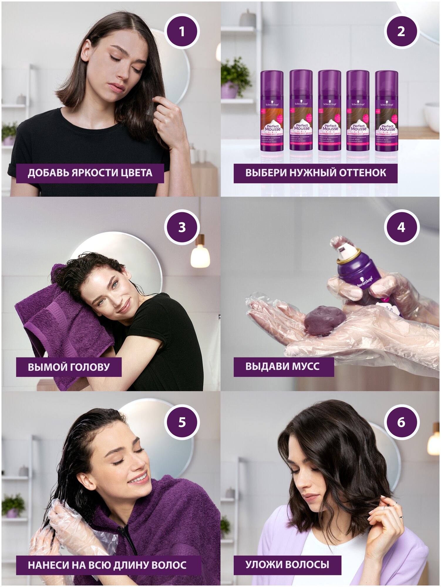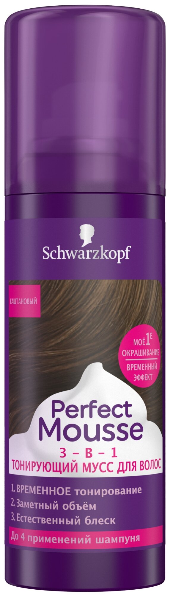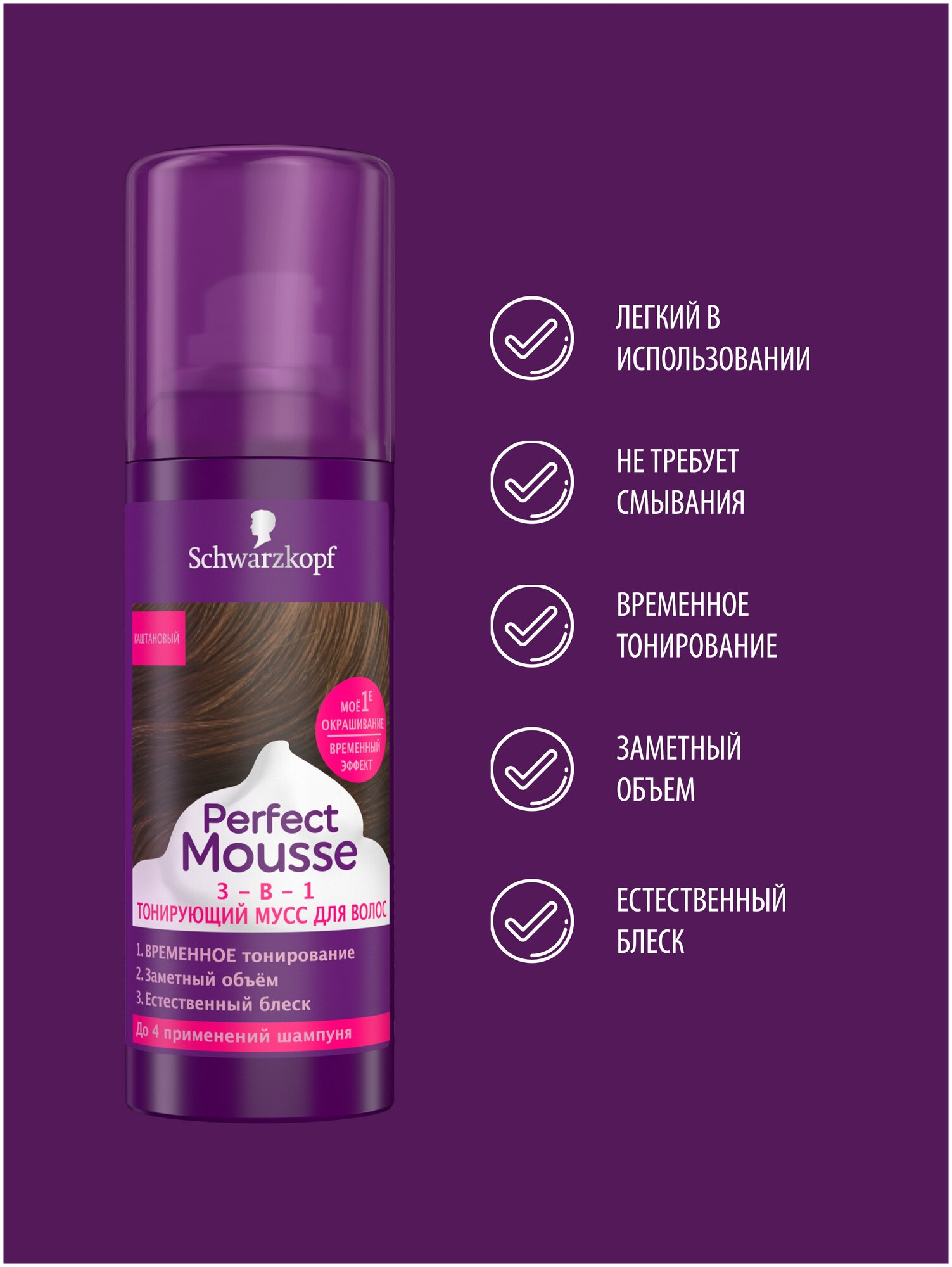 - ЦВЕТ, ОБЪЁМ и БЛЕСК волос с одним средством! Попробуй новинку PERFECT MOUSSE Тонирующий мусс 3-в-1