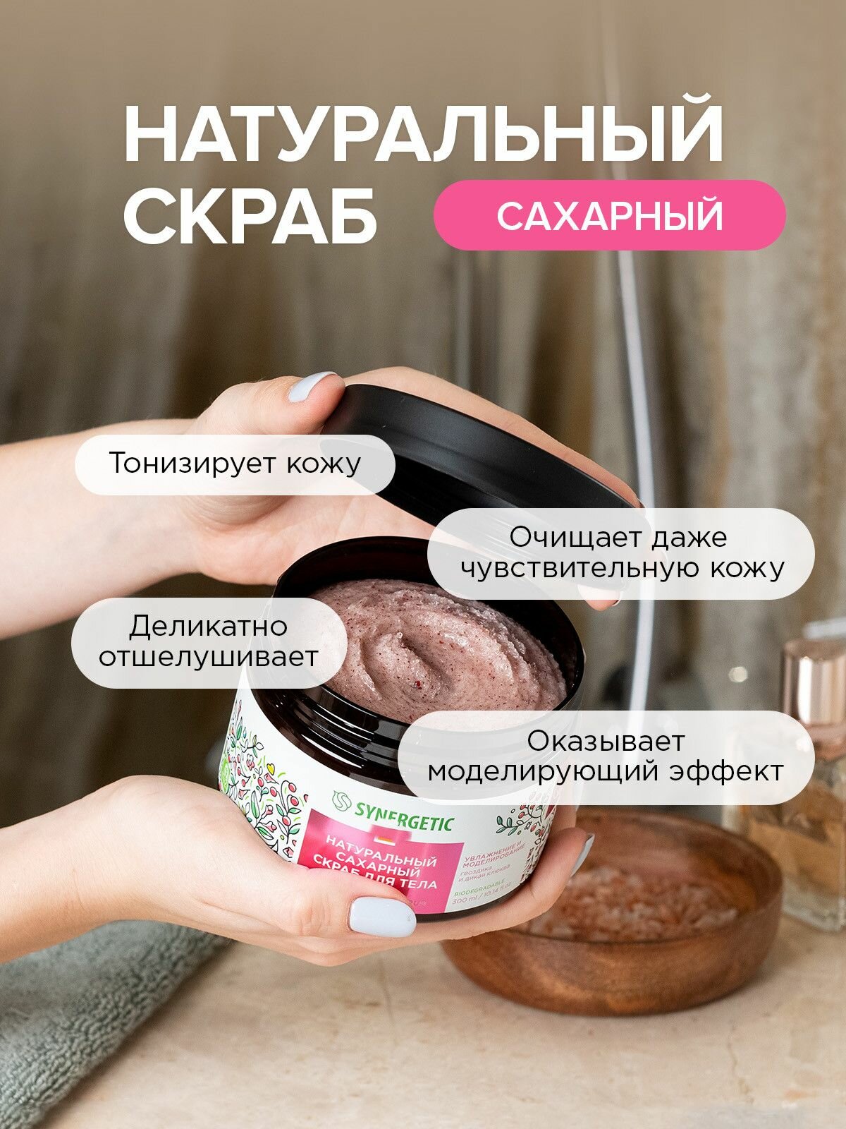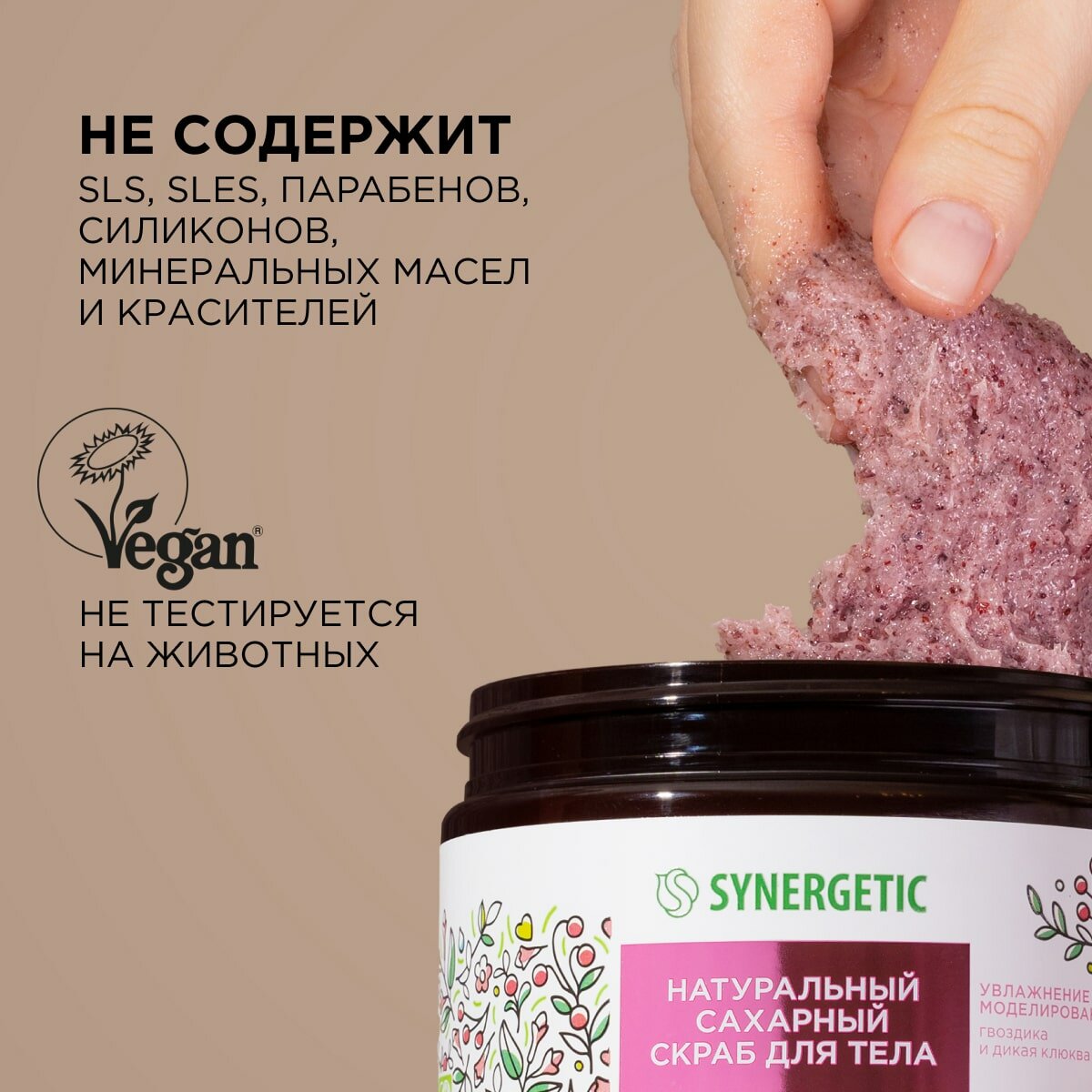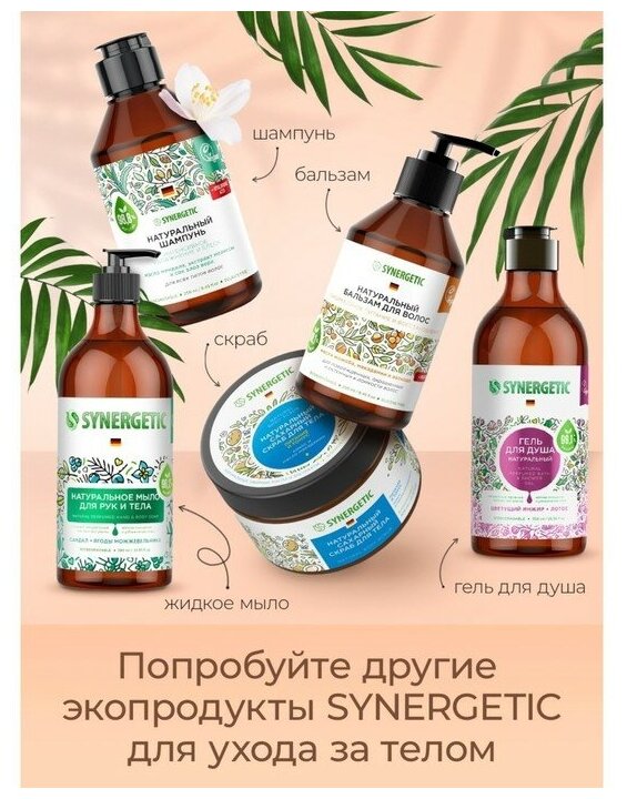 Натуральный сахарный скраб SYNERGETIC подходит для нормальной, сухой и чувствительной кожи. Сахар является естественным увлажнителем и удерживает влагу в коже, смягчая ее. В качестве дополнительного абразива в средстве содержится порошок