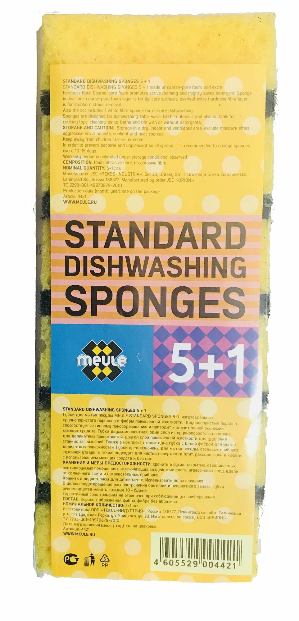 Meule STANDARD Dishwashing sponges 5+1 Губки прямоугольные из крупнопористого поролона с абразивной фиброй. Усиленная склейка поролона с абразивной фиброй. Упакованы в полипропиленовую плёнку с вложением бумажной этикетки.